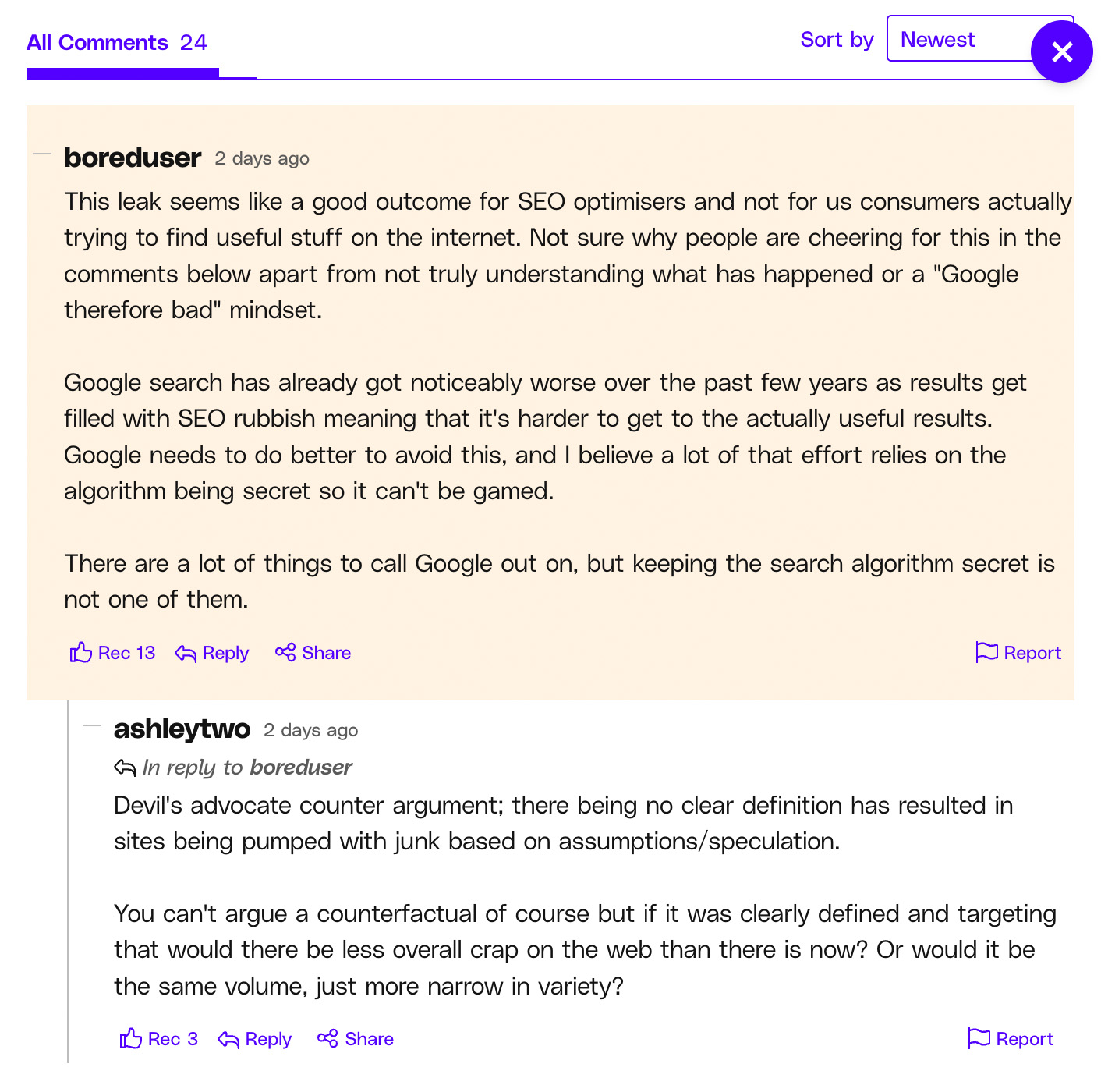 Afsløringerne har naturligvis også skabt engagement i kommentarfelterne. Nogle har udtrykt bekymring for, at lækagen vil gøre det lettere for organisationer at manipulere med søgeresultaterne.