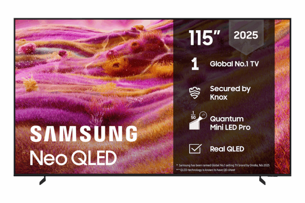 Men 115-tommeren er ikke den eneste kæmpeskærm fra Samsung denne gang. To andre modeller kommer også i supersize: Flagskibet QN990F fås nu i 98 tommer og giver hele 2,7 kvadratmeter skærmoverflade med 8K-opløsning – over 33 millioner pixels for ekstreme detaljer.