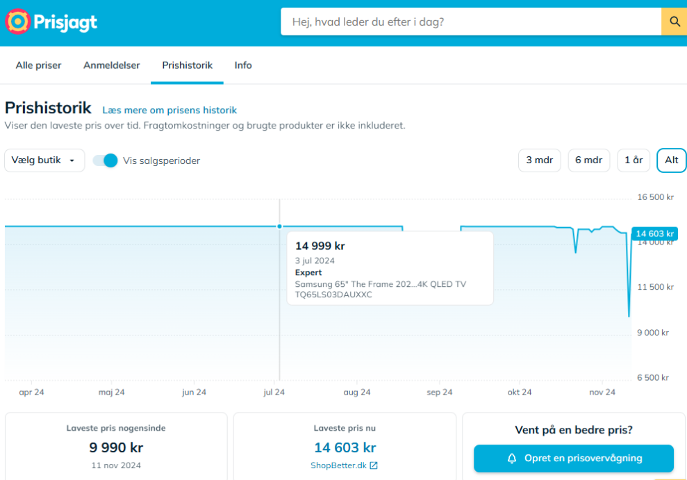 Så længe du er klar over, at priserne vil svinge i løbet af året, kan du alliere dig med prissøgetjenester som Prisjagt, Klarna og Pricerunner. Her kan du tjekke prishistorik, sammenligne priser mellem forskellige kæder og finde den laveste pris på en tilgængelig vare.
