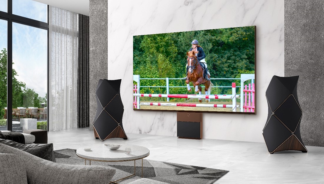 Et TV i ultra high-end-klassen fortjener naturligvis højttalere, der skiller sig ud med stil. Her nytter det ikke noget med en almindelig soundbar, hvis man skal yde det ekstreme lydbillede retfærdighed. LG har fundet løsningen i Bang & Olufsens flagskibshøjttalere Beolab 90, og både lyd og TV kan styres med B&Os luksuriøse fjernbetjening.