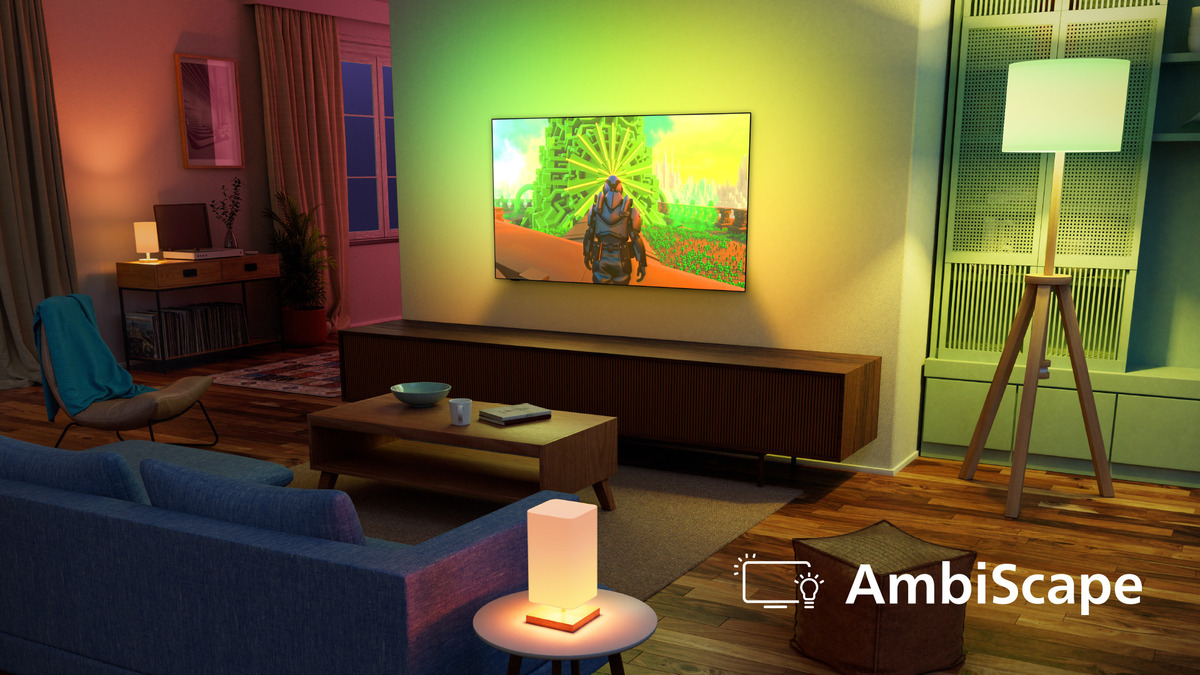 Philips introducerer i år en “ny” funktion kaldet AmbiScape, som lader dig tilslutte og styre op til fire smarte pærer via udvalgte Philips Ambilight-TV. Det skal i udgangspunktet fungere med smartlysmærker som Wiz, NanoLeaf, Philips Hue og Ikea, så disse kan gengive matchende farver fra TV-skærmen og udvide oplevelsen i rummet.