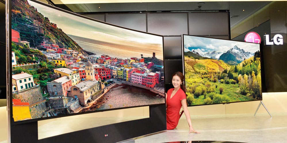 Samsung benyttede året CES elektronikmesse i Las Vegas til at vise gigantiske, buede Ultra HD-skærme frem med tilsvarende astronomiske priser. Formålet var bl.a. at demonstrere fordelene ved den buede form, som bedst kommer til udtryk på store skærme: Billedet bliver mere omsluttende med færre refleksioner fra siderne.