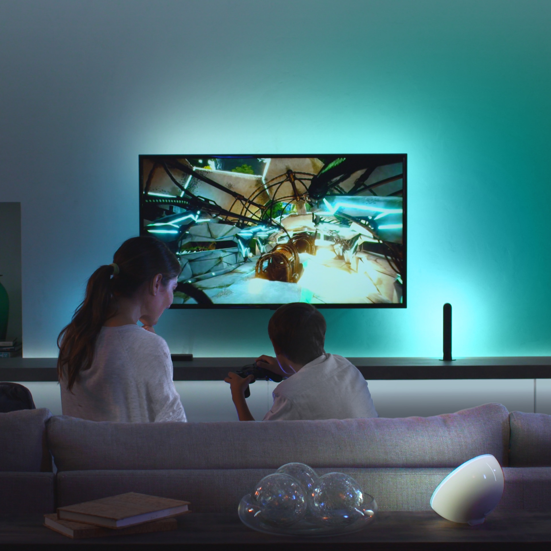 På den måde kan man lave sit eget “Ambilight-lys” og bruge Hue-lamperne til at lyse væggen op eller endda hele rummet.