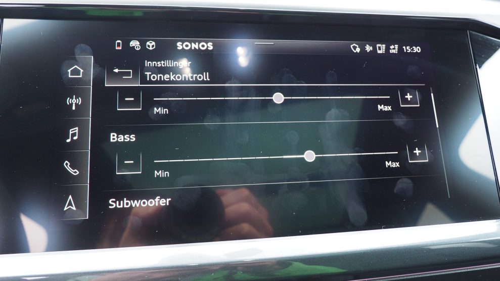 Sonos-anlægget fylder kabinen med et relativt stort og præcist lydbillede med en bred og tydelig stereoeffekt. Klangbalancen er fin og fyldig med distinkte overtoner og en varm mellemtone. Stemmegengivelsen er klar og tydelig, og godt forankret mellem A-søjlerne.