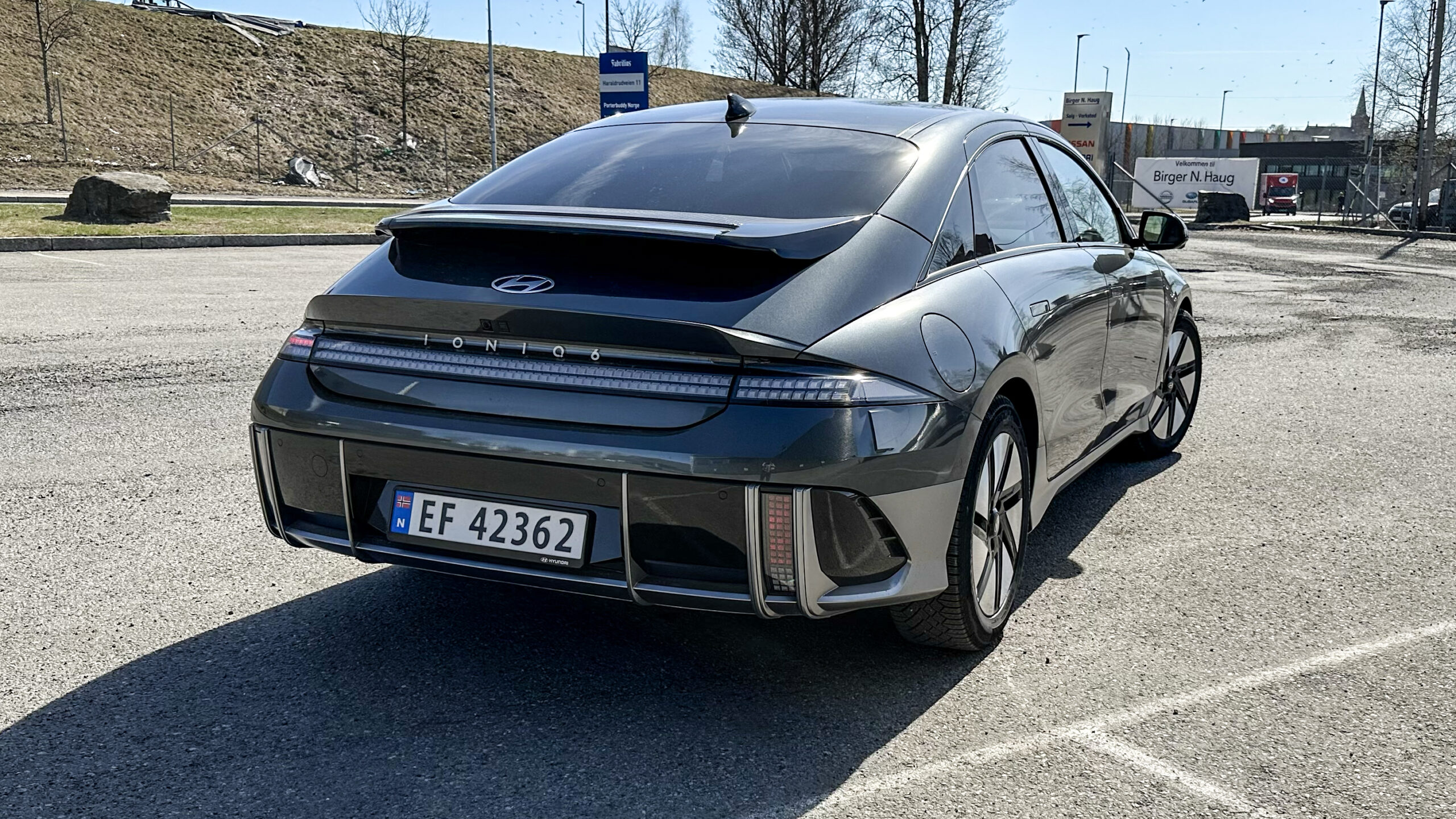 Hyundai har brugt mere end 5.000 timer(!) med supercomputere på at simulere forskellige aerodynamiske justeringer under udviklingen af Ioniq 6. Den silkebløde silhuet med indfældede dørhåndtag, der springer elektronisk ud, og bilen har også fået to små bagvinger: en høj spoiler lige under bagruden og en lavere lige over baglygterne. For at gøre den lidt mere spændende og markant har Hyundai valgt at indlægge bremselys langs hele den øverste spoiler.