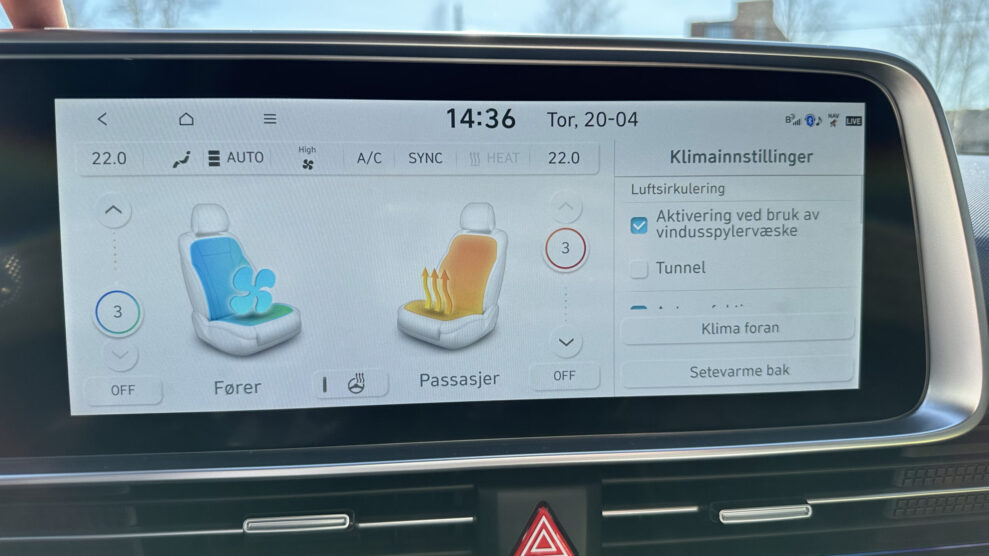 Sæderne er virkelig komfortable. Forsæderne er ventilerede med indbygget varme og køling. Og selv om førersædet mangler benstøtten fra Ioniq 5, kan det indstilles efter ønske på otte forskellige måder, som kan lagres i to hukommelser. Passagersædet kan justeres tilsvarende, men kan ikke gemmes.