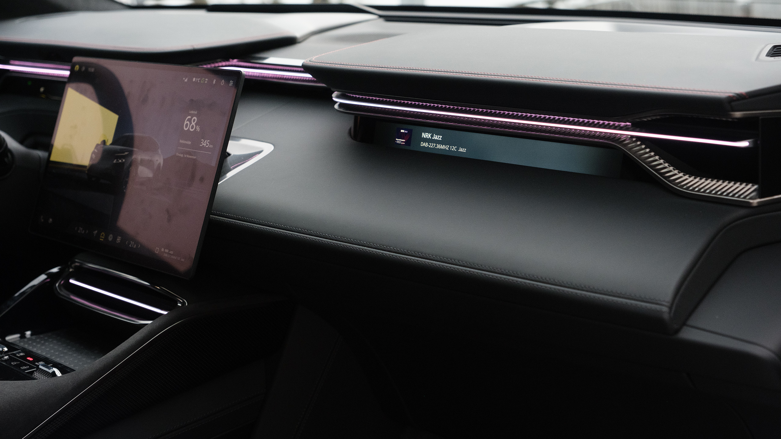 Skærmen foran føreren er en OLED-stribe, som viser de vigtigste informationer. Passageren får også en skærm med mediekontrol, mens resten af informationerne og indstillingerne foretages på touchskærmen i midten af instrumentbrættet. Afhængigt af udstyrsversionen fås der også en skærm til passagererne på bagsædet med betjening af sædevarme og klimaanlæg bagtil.
