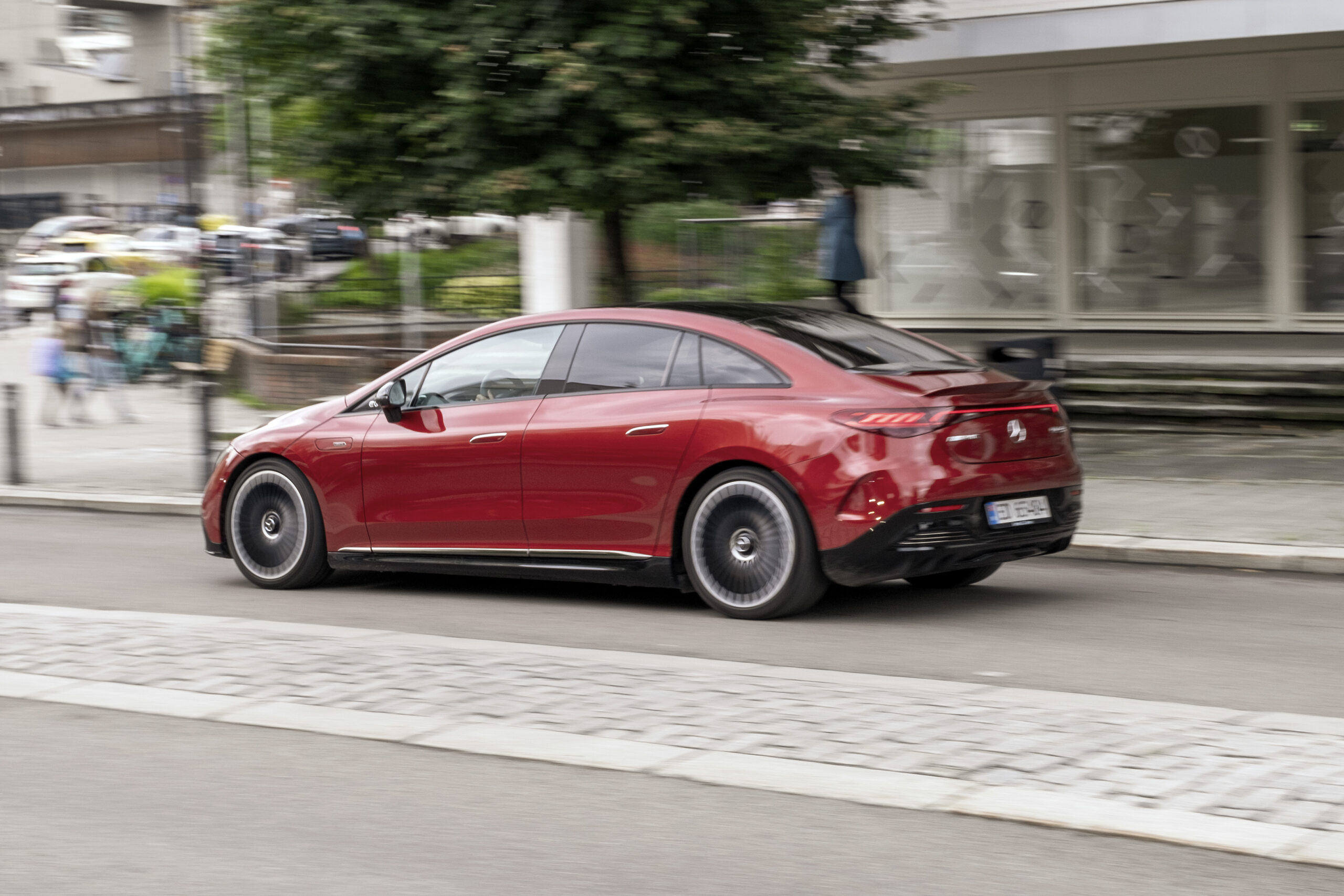 De glatte linjer virker om muligt endnu mere elegante på en kompakt sedan som EQE. Dette er også en bil, der vækker opsigt i gaden, men det har muligvis også noget at gøre med farvevalget på pressevognen! En AMG-model fortjener naturligvis et frækt og anderledes farvevalg, og Hyacinth Red bryder bybilledet med grå og sorte biler – også selv om undertegnede nok foretrækker Spectral Blue metallic.