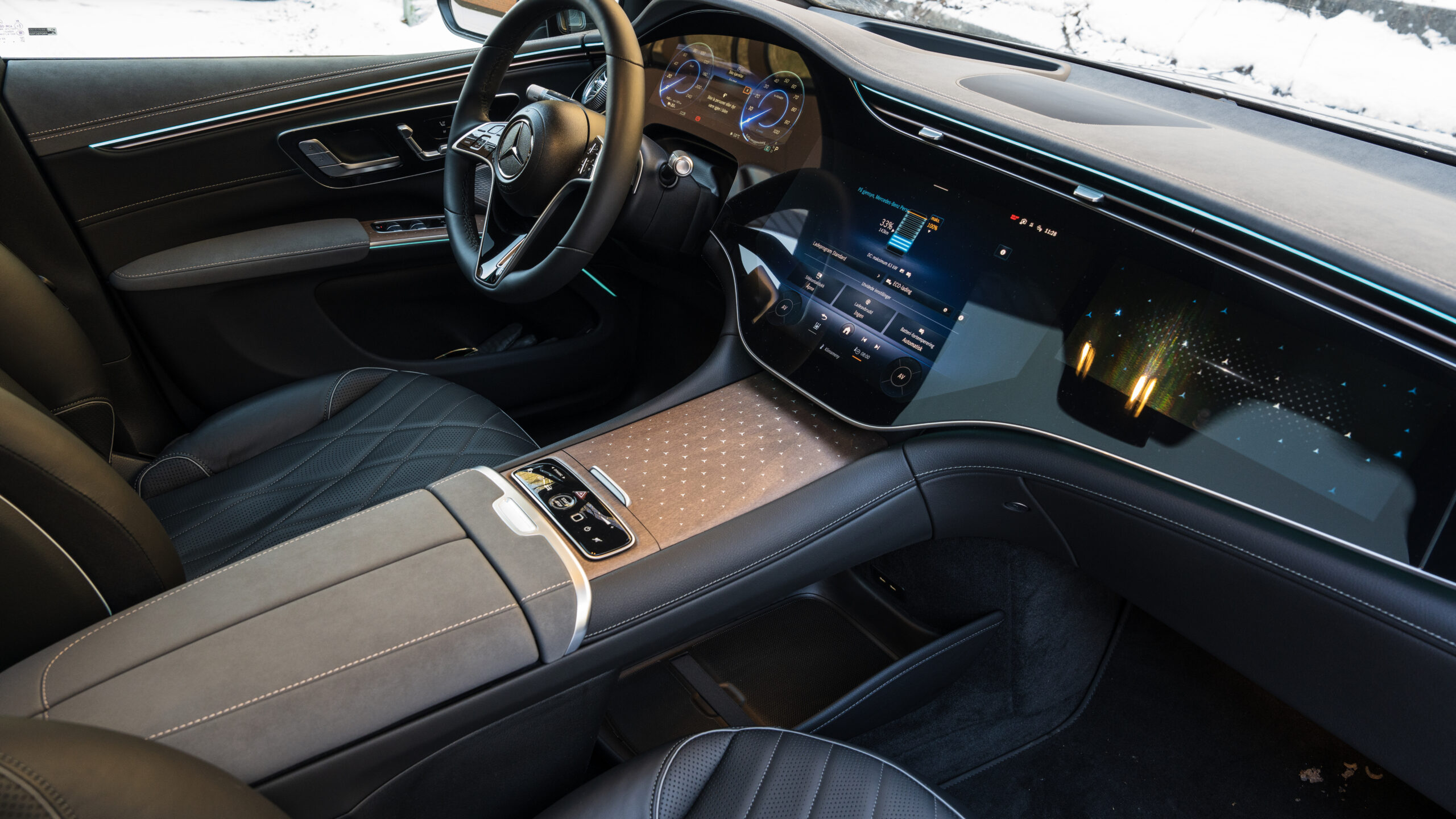 Indvendig i cockpit’et er der klare lighedstræk med EQS, som kendetegnes af det store instrumentbræt, og en bred midtdeler mellem de to forsæder.