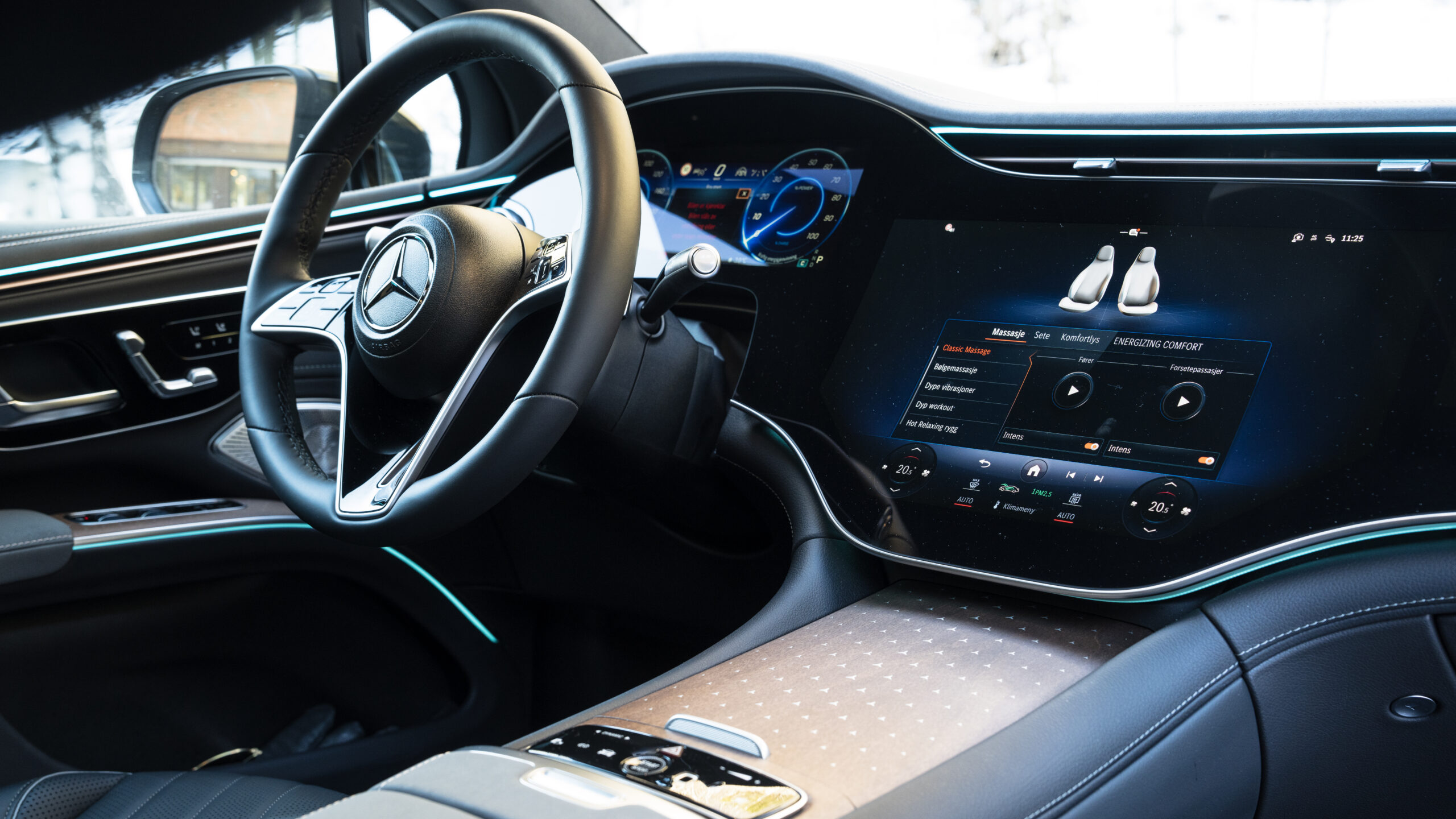 Det dejlige sportsrat giver fuld kontrol, mens de dybe lædersæder med indbygget massage svøber sig godt rundt om chaufføren. Førersædet i EQS SUV er generelt et fint sted at befinde sig, og passagererne har heller ingen grund til at klage.