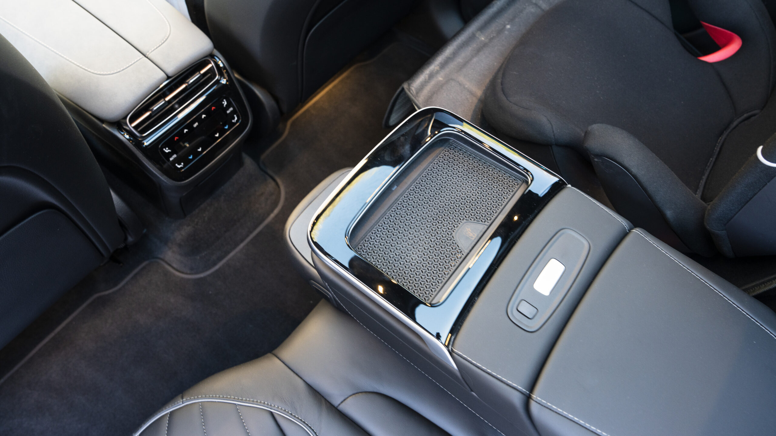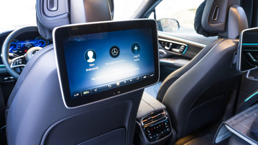 Vores testmodel har også touchscreens til bagsæderne (MBUX rear seat entertainment), hvor du kan styre musikafspilning, navigation og komfortindstillinger – nærmest alt undtagen at styre selve bilen.