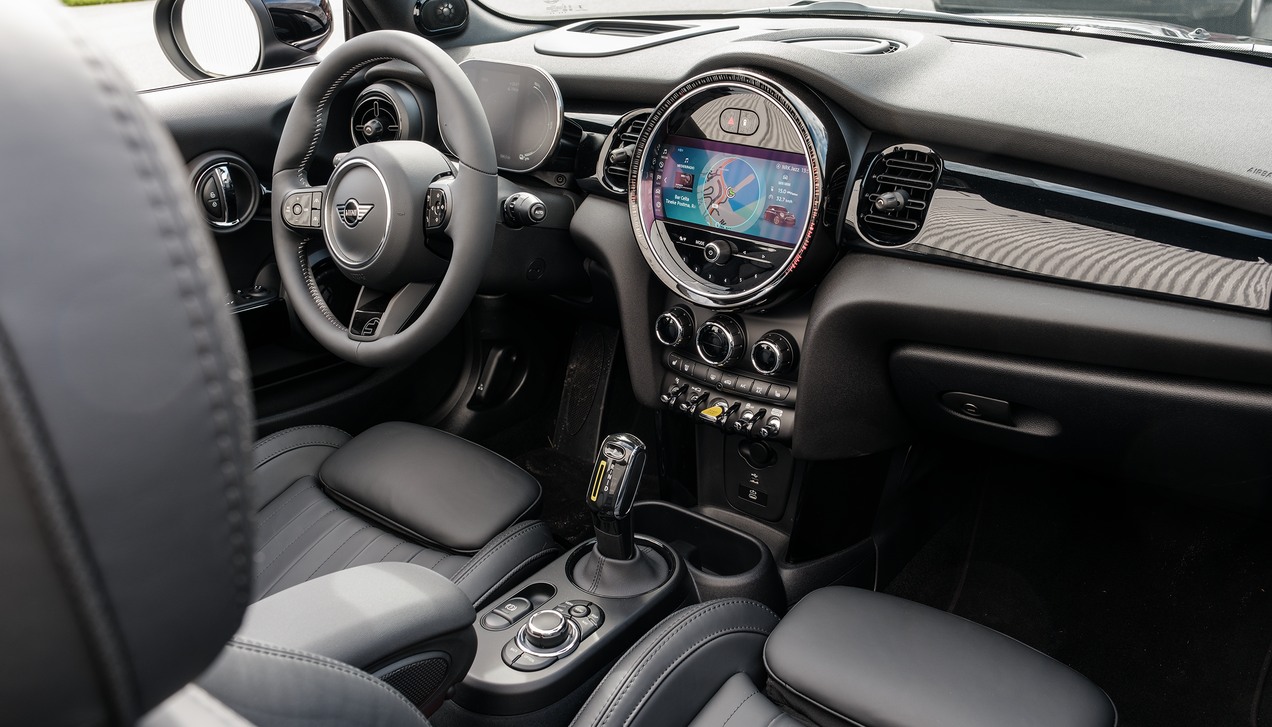 Små detaljer – som at baglygterne er en Union Jack delt i to, og at samme mønster gentager sig på ydertaget og genfindes indeni – skaber god stemning for både ejer og tilskuere. Det falske luftindtag foran er en helt unødvendig detalje, da der er en 135 kW elmotor under motorhjelmen, og ikke en turboladet benzinmotor.