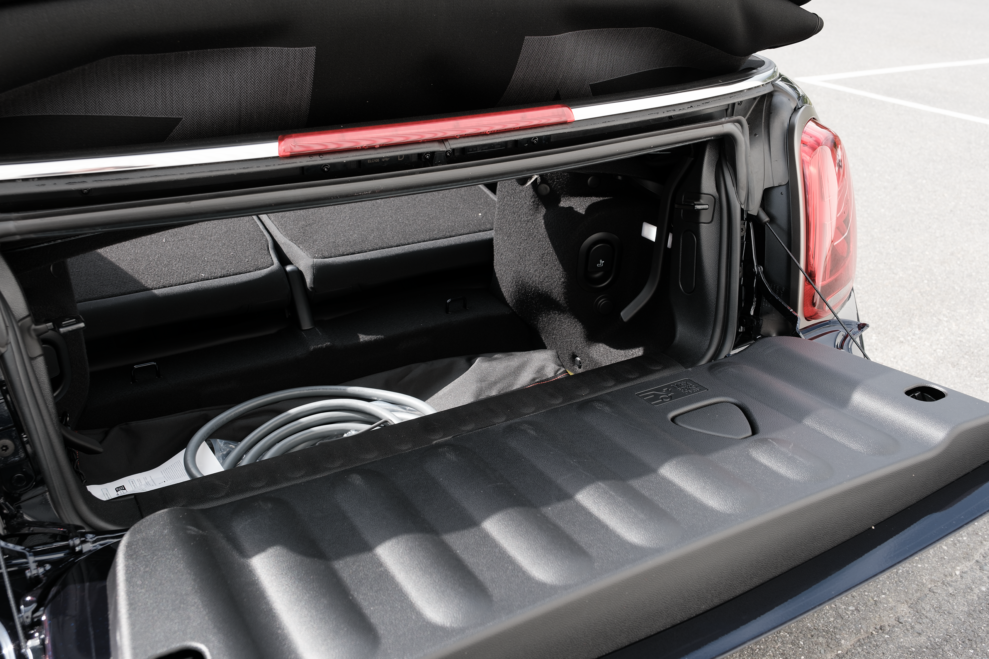 Drivlinjen kender vi fra vores test af Mini Cooper SE. Et lille 32,6 kWt batteri giver en teoretisk WLTP rækkevidde på 228 km i versionen med tag. Den topløse vejer en del mere, og rækkevidden er således reduceret til 201 km (WLTP). Det er den korteste i klassen.