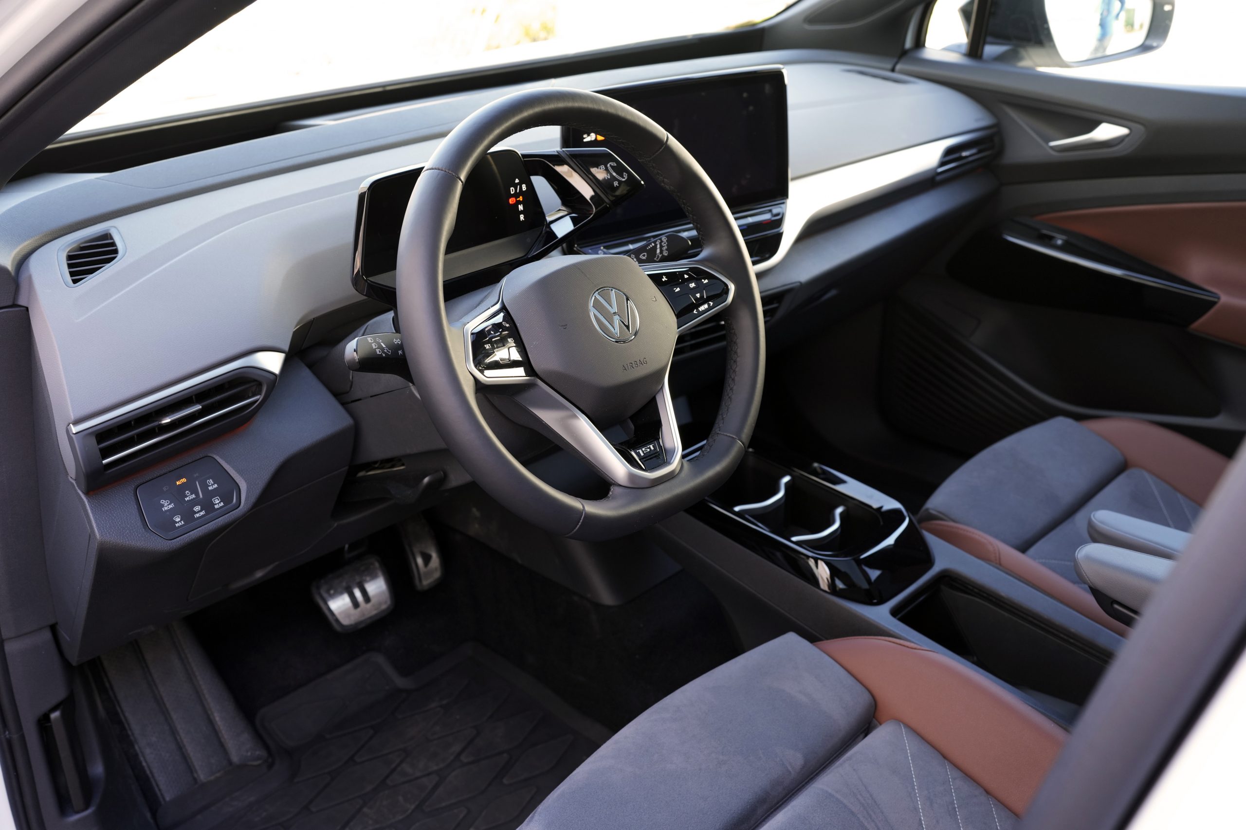 Et kig ind i begge biler vender dette indtryk på hovedet. For hvor instrumentbrættet på ID.4 giver en lidt billig plasticfølelse, er der læder de rigtige steder i Ecosuite-versionen af Enyaq iV, som jeg har fået til test. Her er brunt læder, som står i skarp kontrast til bilens mørkegrå ydre (i vores tilfælde hedder farven Quartz Grey). ID.4 kan derimod slet ikke fås med læderindtræk.