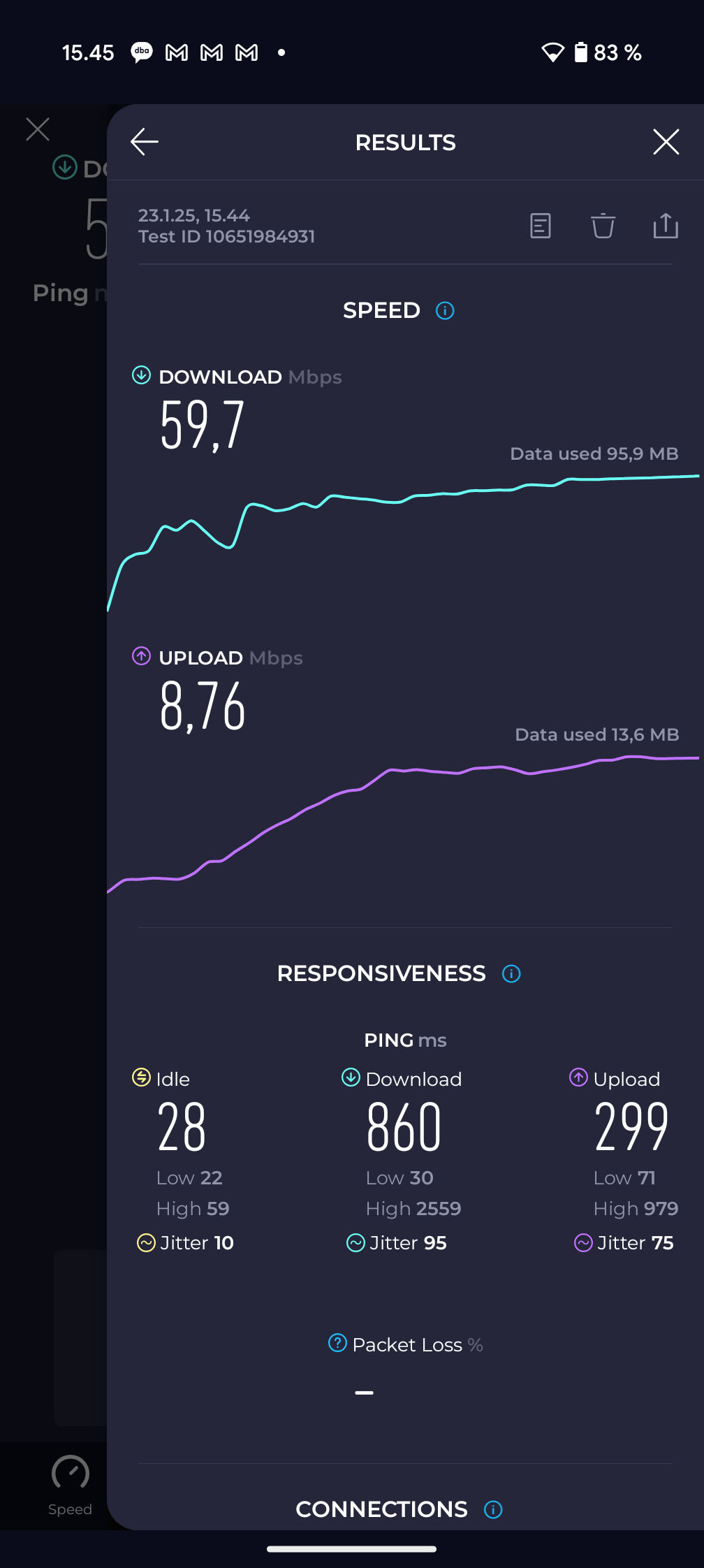 Jeg testede hastigheden andre steder i området, og den højeste hastighed, som jeg opnåede, var 768 Mbit/s. Og dette var vel at mærke i en stor provinsby med et fuldt udbygget 5G-antennenetværk. Hvis tanken er at bruge Netgear Nighthawk M3 eller en anden mobilrouter i sommerhuset, kan der være langt til nærmeste mobilmast.