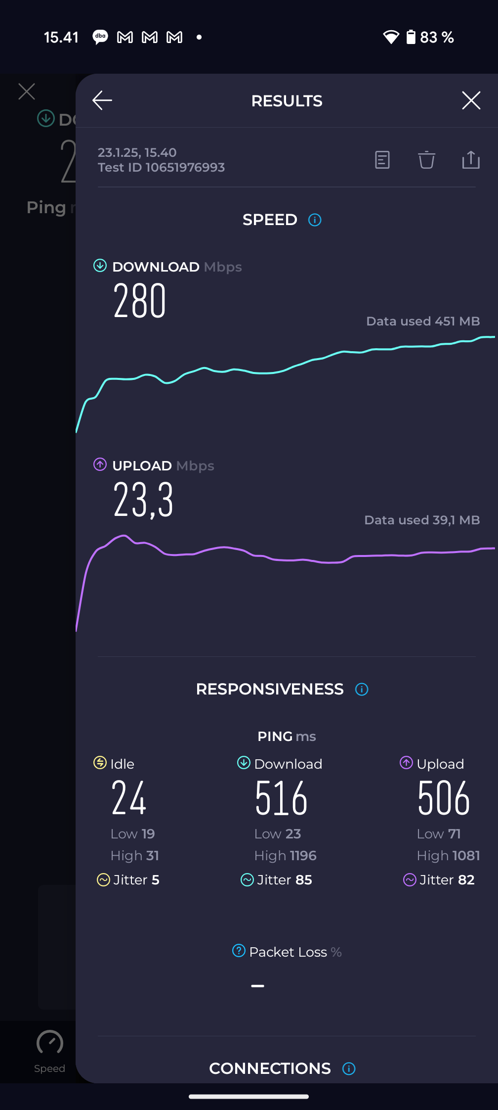 En downloadhastighed på 280 Mbit/s er i sig selv aldeles brugbar, og for få år siden ville den have været fantastisk selv på en kablet forbindelse. Men sammenlignet med det teoretisk opnåelige, er der langt mellem teori og praksis.