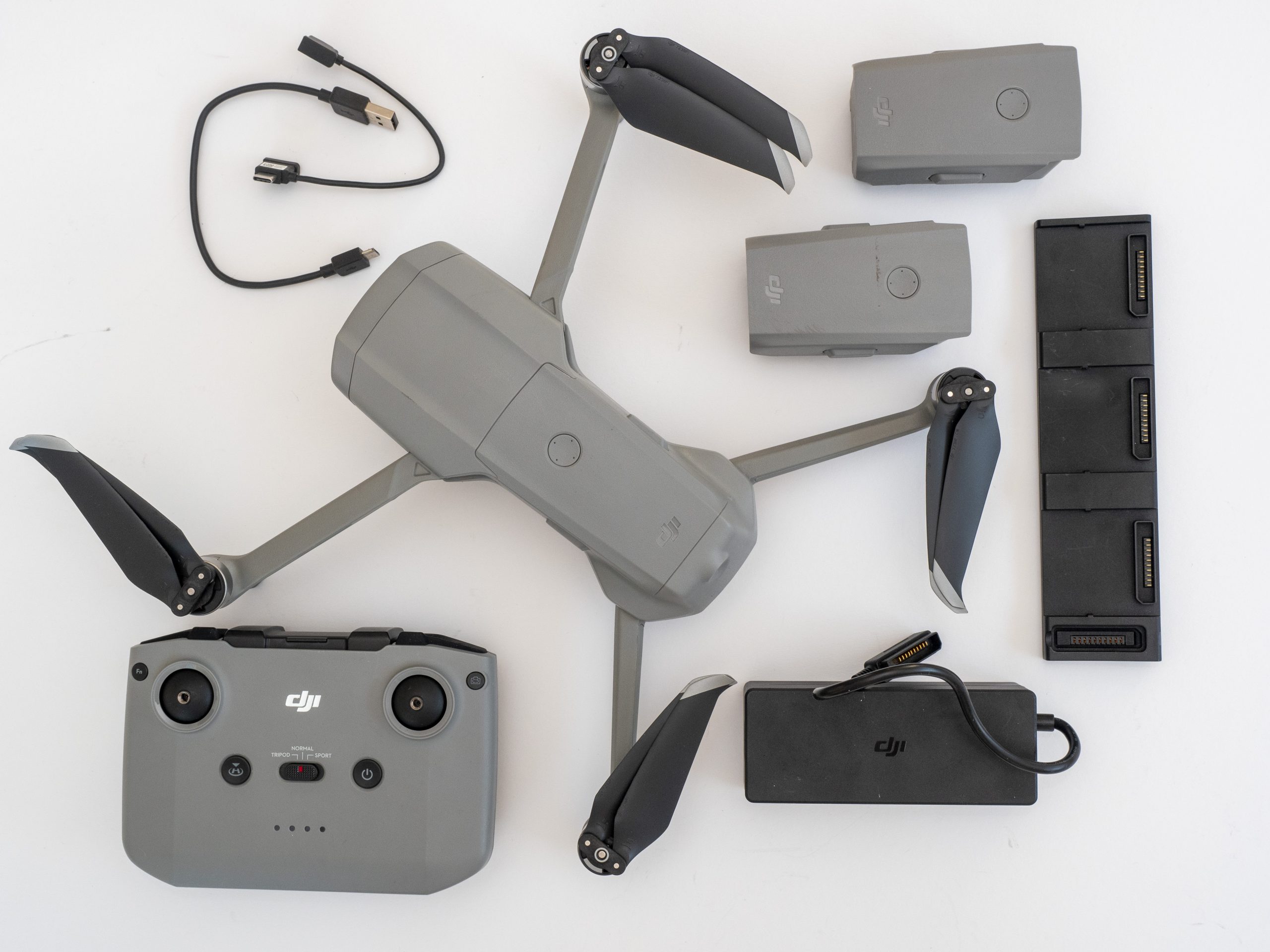 Mavic Air 2 fås i en basispakke med drone, batterioplader og fjernbetjening, men også i en Fly More Combo-version med en del ekstraudstyr i pakken.