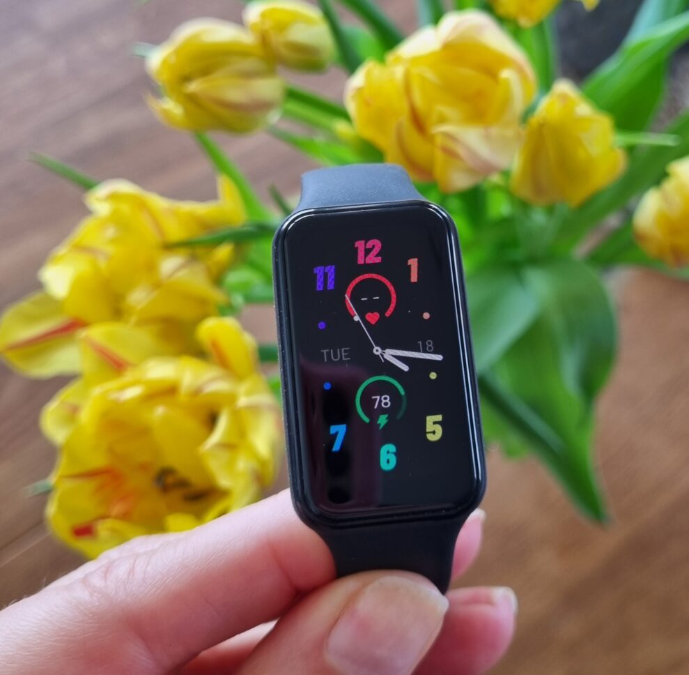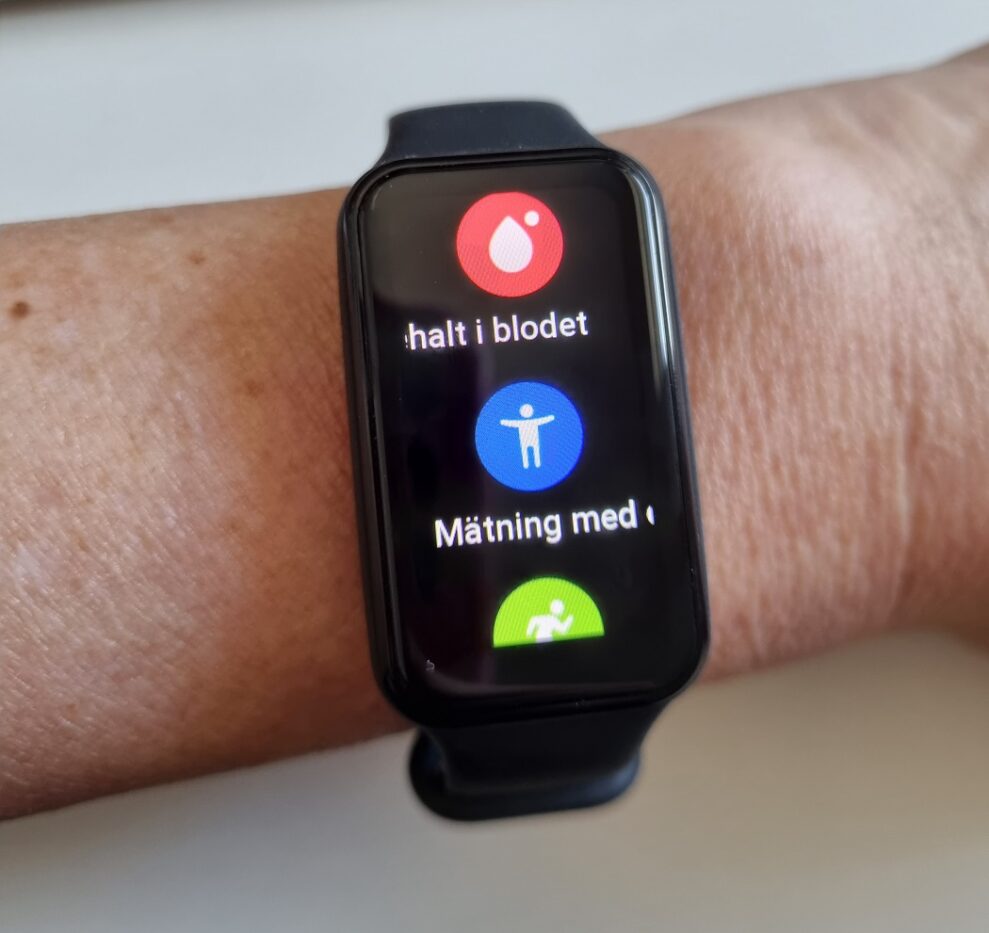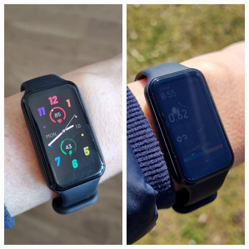 Armbåndet er blødt, glat og fleksibelt, og jeg lægger næsten ikke mærke til, at jeg har det på. Jeg føler mig lidt splittet, når det gælder skærmen. På den ene side er det godt, at den er stor, for det gør den tydeligere for mig, der er 50+, men på den anden side er den lidt for stor til at passe ind i armbåndskategorien.