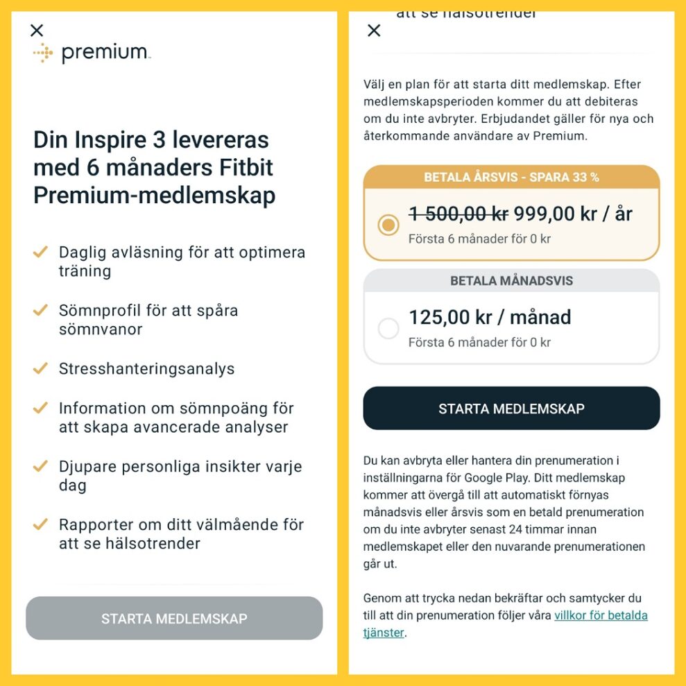 Men … For at få adgang til al den information, som armbåndet faktisk er i stand til at indsamle og sammenholde, er jeg nødt til at tilkøbe Premium. Det er ganske vist gratis de første seks måneder, men derefter koster det penge. 125 kr./måned for at være helt nøjagtig, hvis du vælger at betale månedsvis.