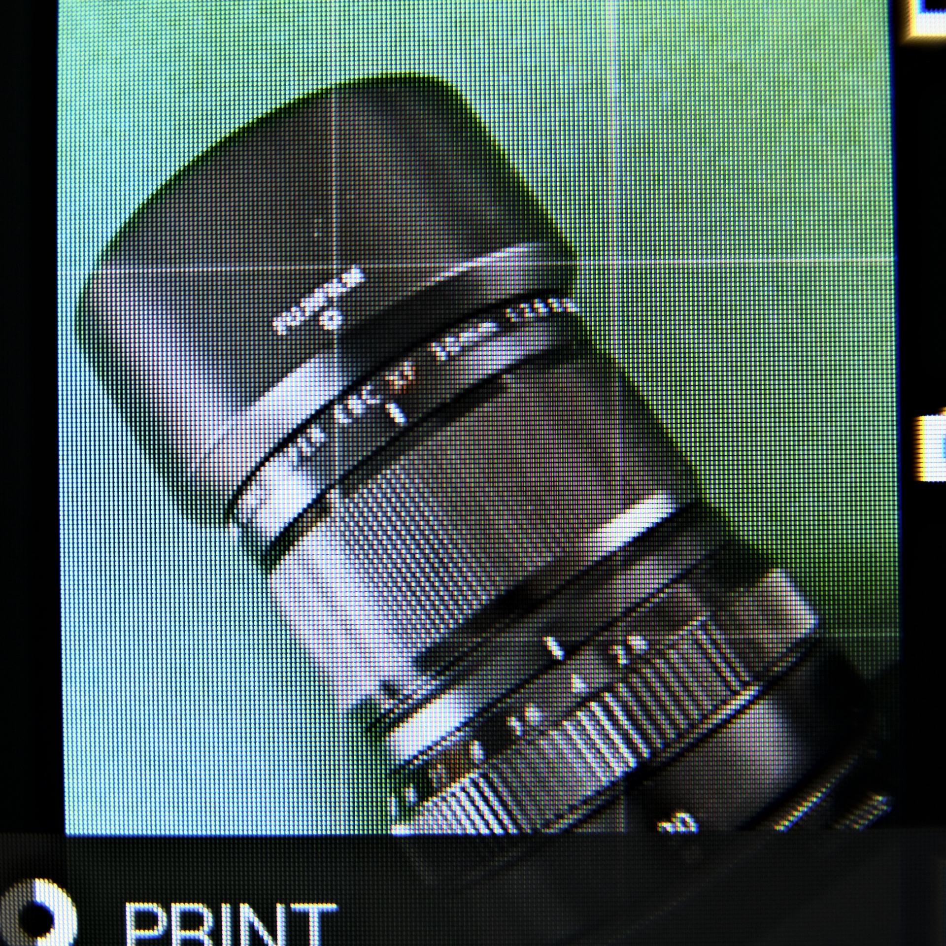 Den lille skærm på bagsiden har ikke særlig høj opløsning, hvilket man især bemærker, når man sætter okularet på skærmen. Skærmen viser også en enkel indstillingsmenu, hvor man bl.a. kan slå blitzen til og fra og indstille kvaliteten på optagelserne.