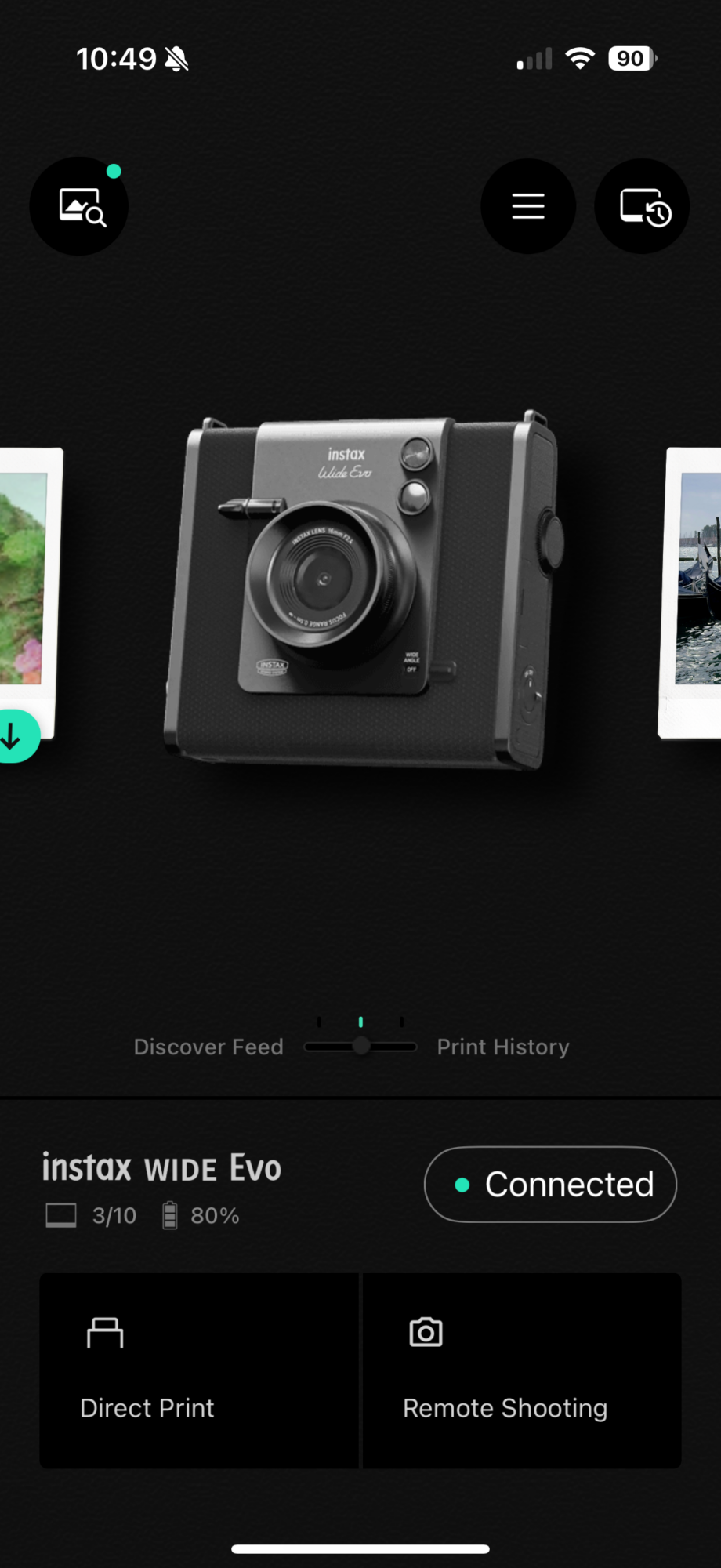 Kameraet kan også printe billeder fra din mobiltelefon. Download instax-app’en, og vælg WIDE Evo, så kan du vælge billeder på din mobiltelefon, tilføje effekter, rammer og tekst og udskrive fra kameraet. Billederne fra WIDE Evo kan også overføres til din mobiltelefon og deles som instax-billeder, hvor du vil. Kameraet kan også fjernstyres fra mobilapp’en. Det er praktisk, hvis du f.eks. sætter kameraet på et stativ.