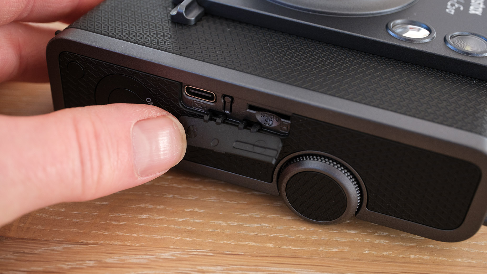 Der er en lille kontakt på forsiden, som skifter mellem normal brændvidde og en endnu større vidvinkel, og over den er der et lille selfiespejl.