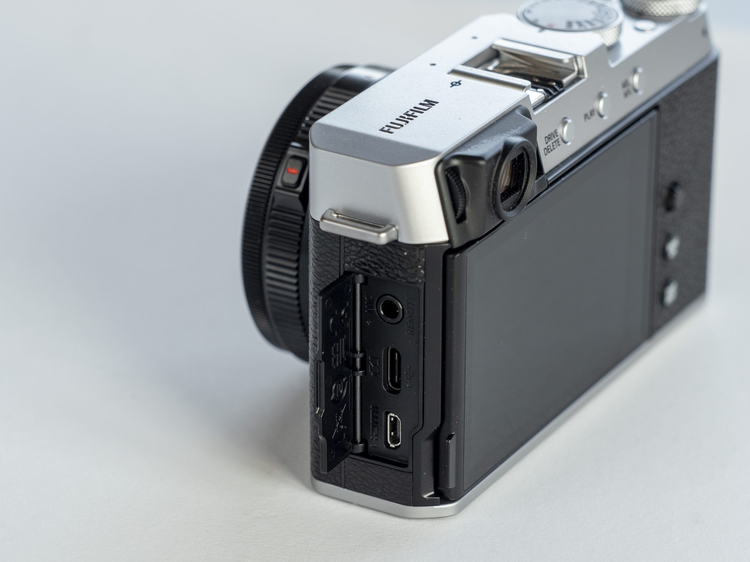 Derimod mangler X-E4 billedstabilisering, og der er kun plads til ét, ikke to hukommelseskort her.