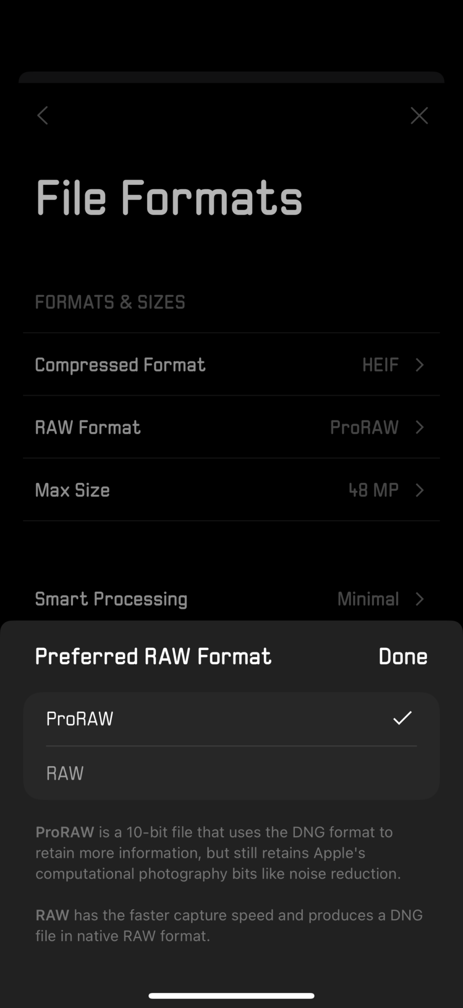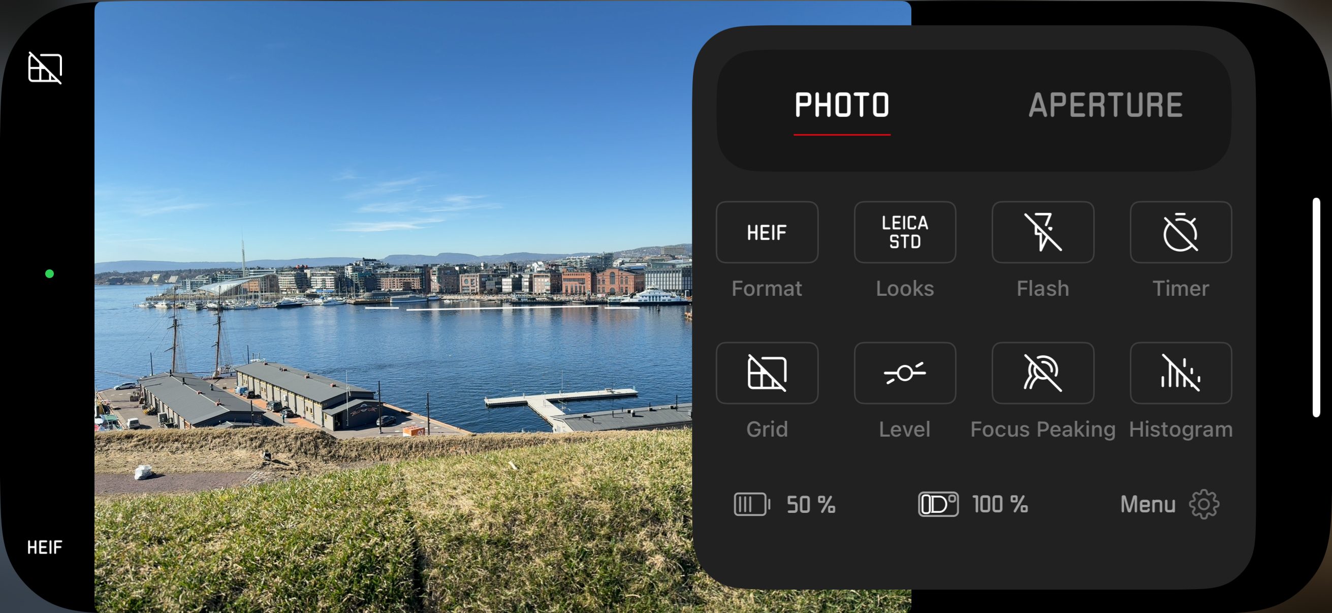 Det er ret flot udført, må jeg medgive, og app’en har en menu til valg af indstillinger som f.eks. billedformater – og her kan man vælge mellem RAW og RAW Pro – hvor RAW Pro gemmer billederne som en 10-bit DNG-fil. Det er også muligt at få vist et histogram, og der kan tilføjes focus peaking på skærmen. Hvis du klikker fra Photo til Aperture i app’en, kan du indstille blændeværdier fra f1,4 med indstillingshjulet på forsiden af grebet.