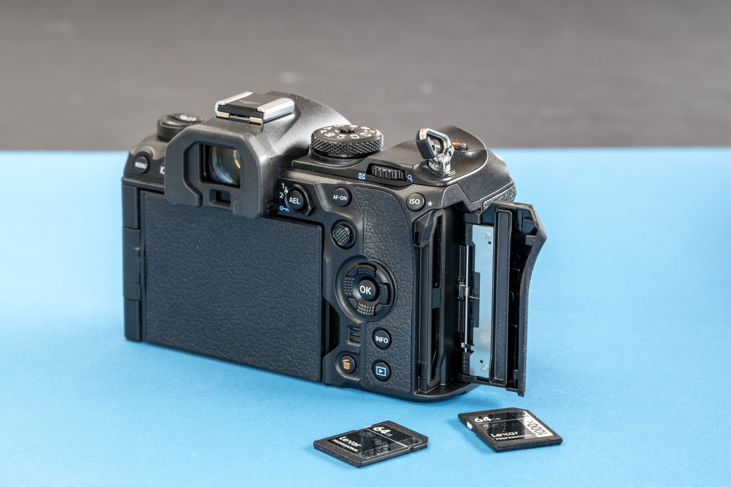 To kortpladser er blevet standard på de fleste kameraer, og OM-1 har to lettilgængelige pladser til SD-kort med UHS-II på højre side. Der er også et stik til kablet fjernstyring. På den modsatte side finder man en USB-port, som man kan bruge til at oplade batteriet med, stik til mikrofon og hovedtelefoner samt en HDMI-udgang til video.
