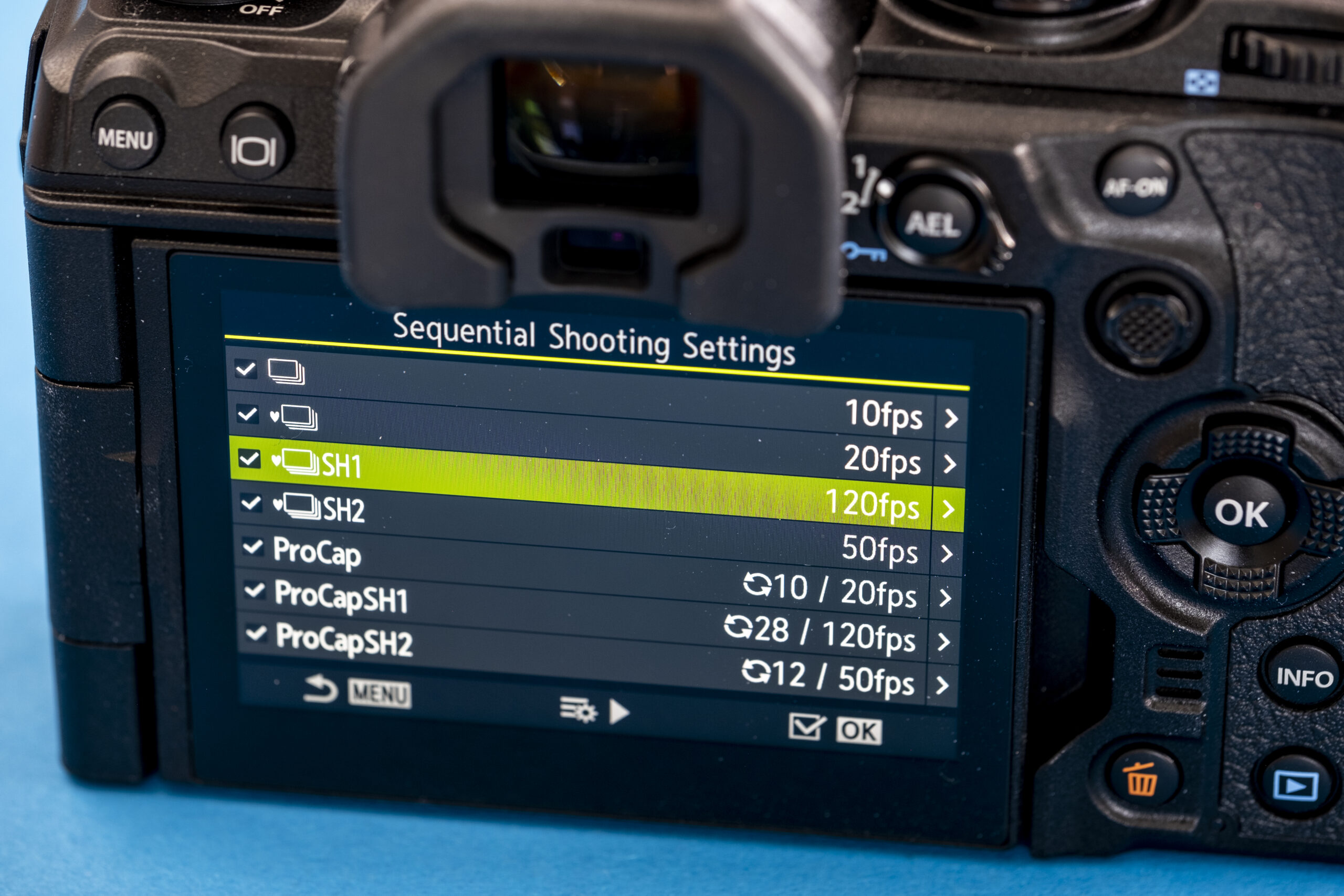 Skudtakten kan indstilles fra 10 til 120 fps (billeder i sekundet) og hele 50 fps med fuld lysmåling og fokus mellem hvert billede i raw eller jpeg. Uden black-out i søgeren. Vælger man 120 fps, låses eksponering og fokus på det første billede, men hvor er det dog rart at have muligheden.