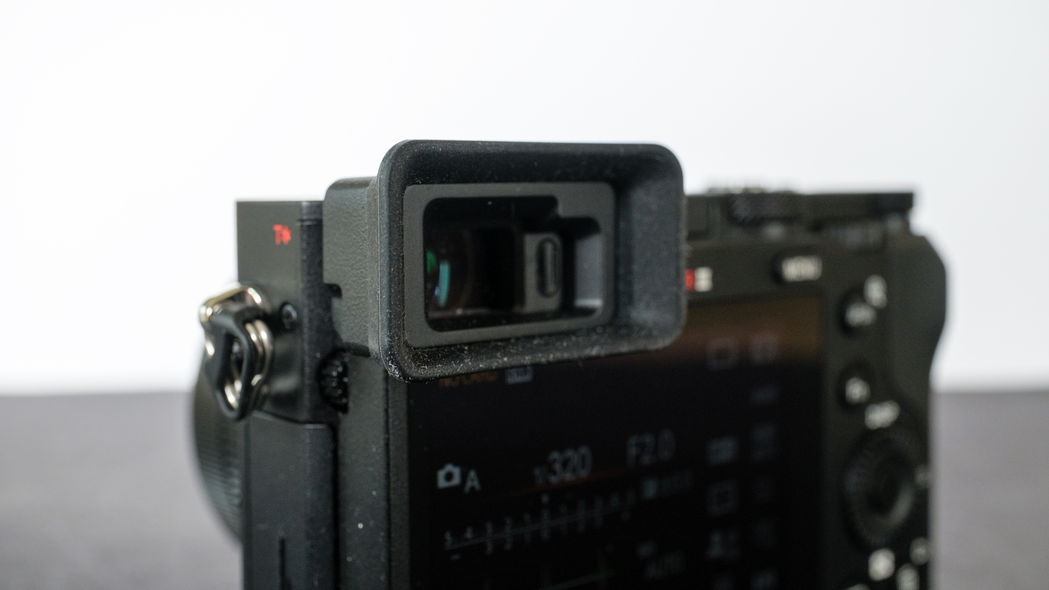 En strømadapter til opladning er ekstraudstyr, ligesom en skærmbeskytter i glas, men der medfølger en aftagelig øjestykke, som skrues fast omkring søgeren.