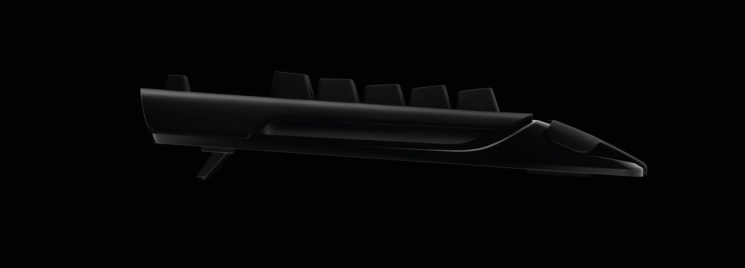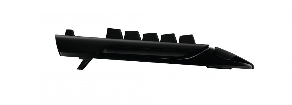 Modelnummeret, G910, står skrevet med lysende bogstaver “i luften” i et lille vindue i håndledsstøtten. Det ser Blade Runner-agtigt ud, men er ren pynt – og landingsplads for støv og kagekrummer. Både taster og bund er i matsort plast. Ud over de almindelige taster er der et sæt multimedietaster til afspilning af lyd og video samt hele ni programmérbare taster til makrokommandoer. De mange funktioner optager en del plads, så G910 Orion Spectrum er både bredere og dybere end noget andet tastatur i testen.