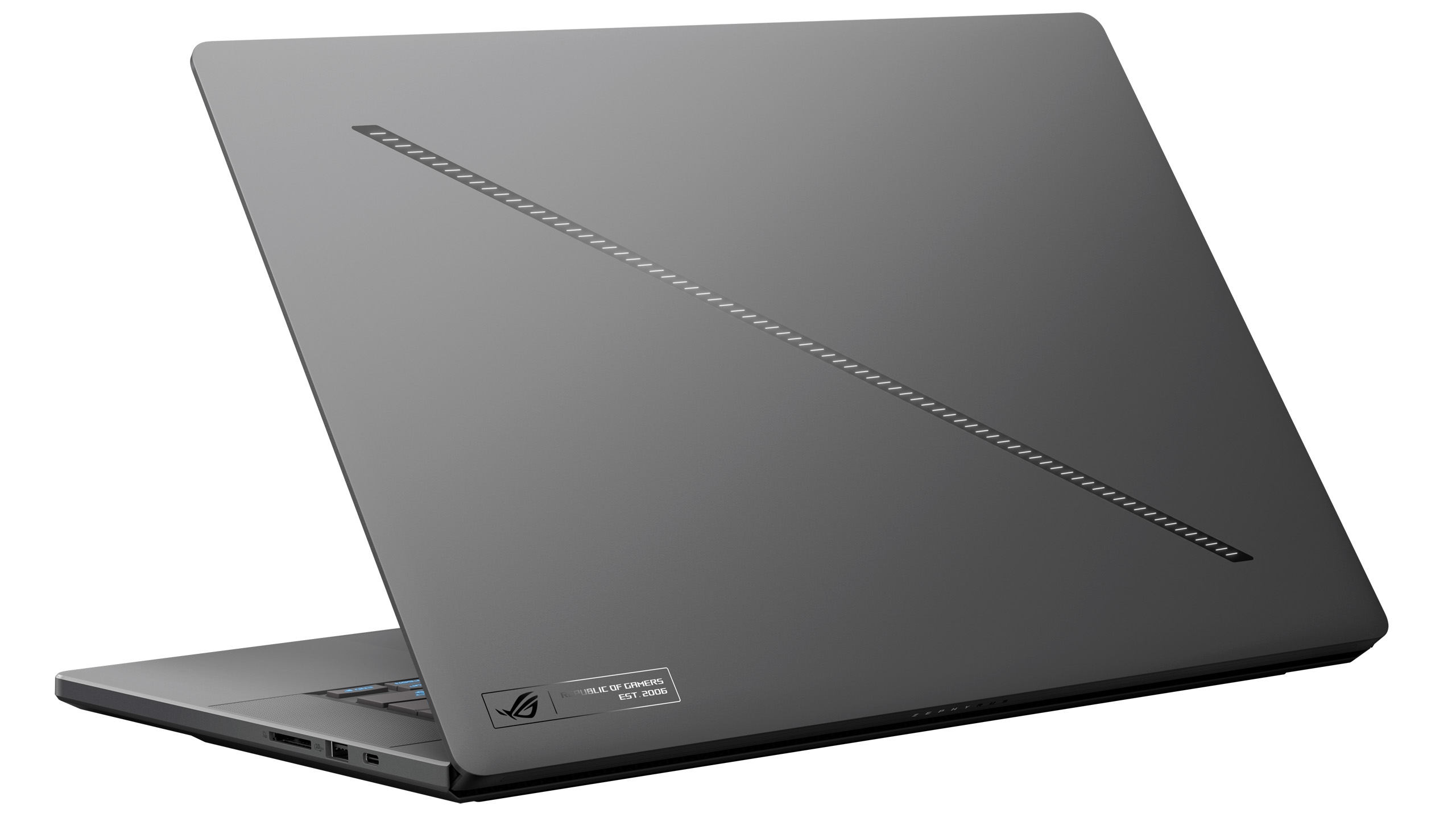 Asus ROG Zephyrus G16 adskiller sig markant fra de tre andre maskiner i testen. Kabinettet er titaniumgråt metal i stedet for sort, hvilket giver et raffineret udseende, der ikke skriger “gaming” på samme måde som konkurrenterne.