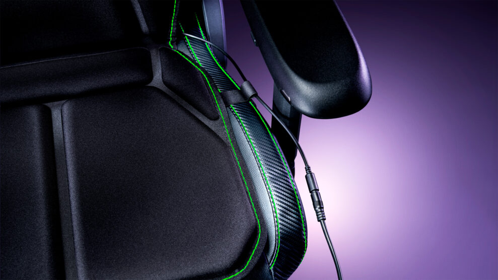 Razer Freyja er det andet produkt til dato, der rummer Razer Sensa HD Haptics-systemet. Det første var headsettet Razer Kraken V4 Pro, som vi testede for nylig. Haptisk feedback vil sige, at følesansen bringes i spil. Når du i spillet bliver ramt af et sværd eller et projektil, mærkes det som et stød i kroppen. Og den haptiske feedback kan også formidle mere subtile effekter, for eksempel en rumlende følelse, når der er magi med i spillet – eller en kampvogn kører tæt forbi.