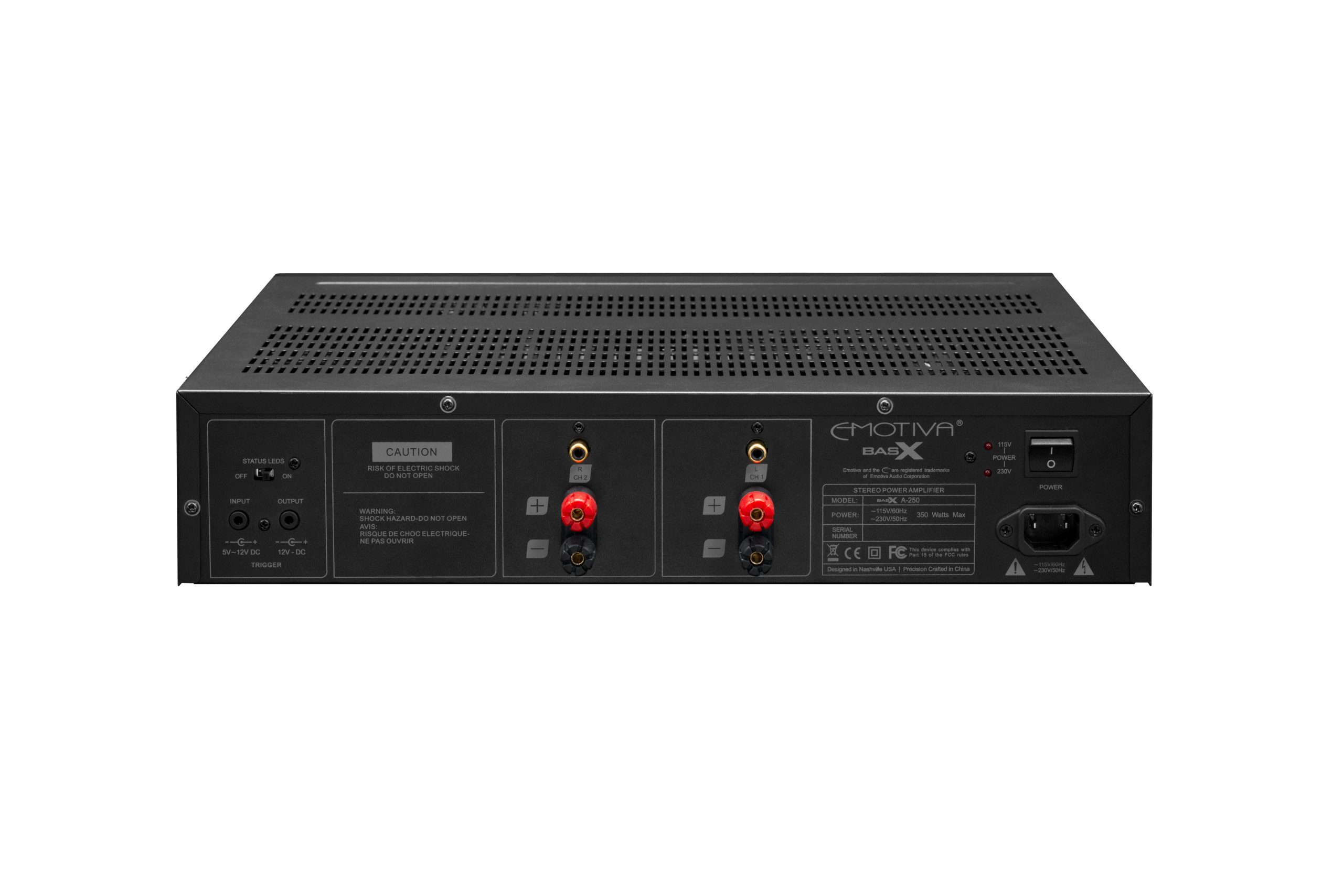 Bagsiden er lige så minimalistisk: Et sæt RCA-indgange og et sæt højttalerterminaler. Det er alt. Kabinettet er lige så sort og kantet som på de øvrige Emotiva-komponenter. Men en effektforstærker skal se maskulin ud!