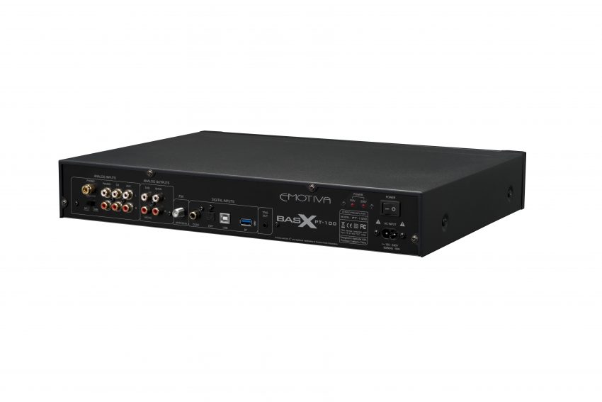 Emotiva PT-100 ligner til forveksling AT-100: En lav enhed bygget i sorte stålplader og med samme voldsomt tykke aluminiumfrontplade. Den store, ensomme volumenkontrol og det store blå display går også igen fra receiveren.