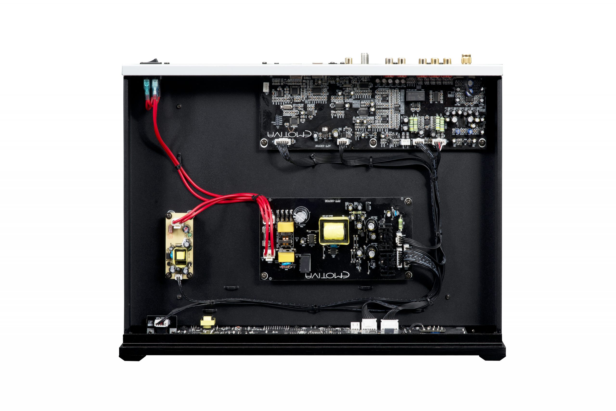 Med alle de fællestræk er det syn, der møder én, når man skruer låget af, ingen overraskelse. Hele forforstærkerprintet er nemlig identisk med det, der sidder i Emotiva TA-100! Strømforsyningen er dog lidt mindre, da den ikke også skal levere energi til en 2 x 50 watt effektforstærker.