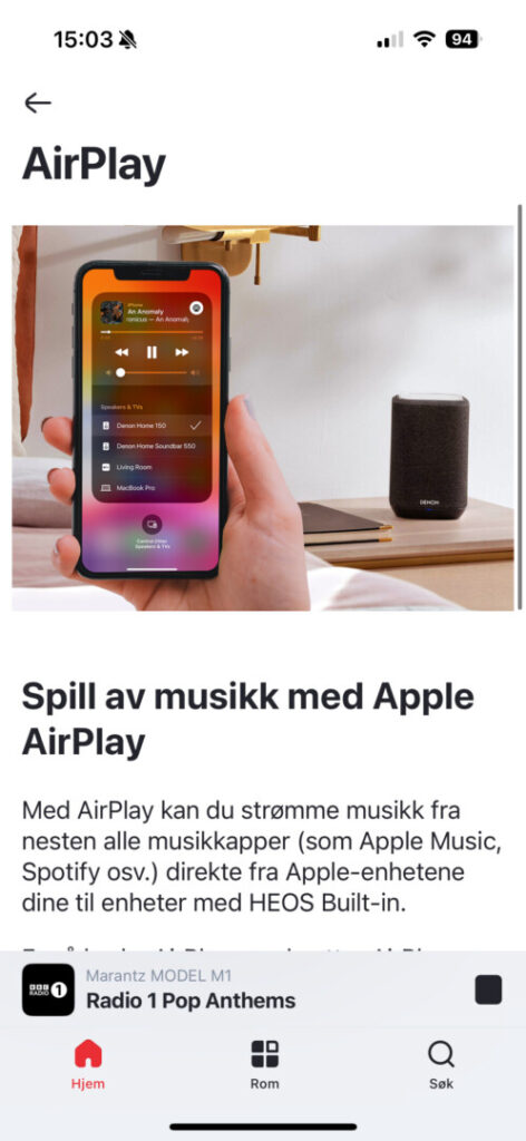 Det tog mig to minutter at tilslutte forstærkeren til netværket. Derefter var det bare et spørgsmål om at vælge en radiostation eller en anden lydkilde. Alt styres fra HEOS-app’en, hvor du også finder indstillinger for bas og diskant, men ingen equalizer.