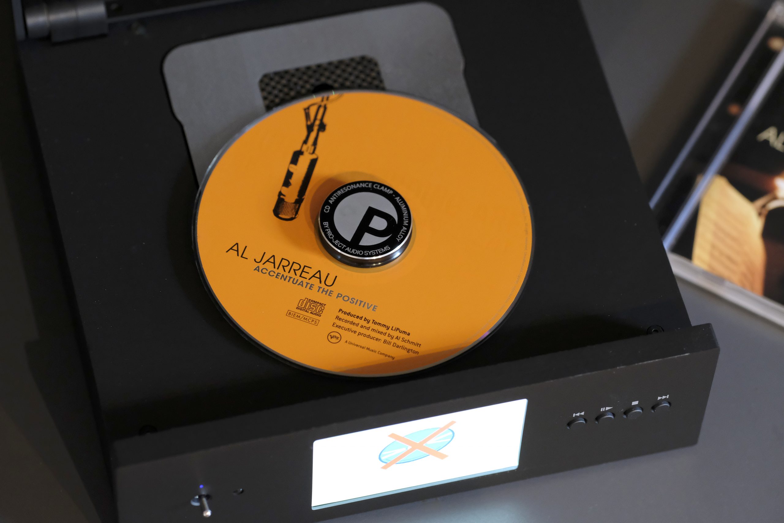 CD’en placeres direkte på spindlen med en lille magnetisk klemme, der lægges over den, og så er det bare at sænke det dæmpede låg og spille noget musik.