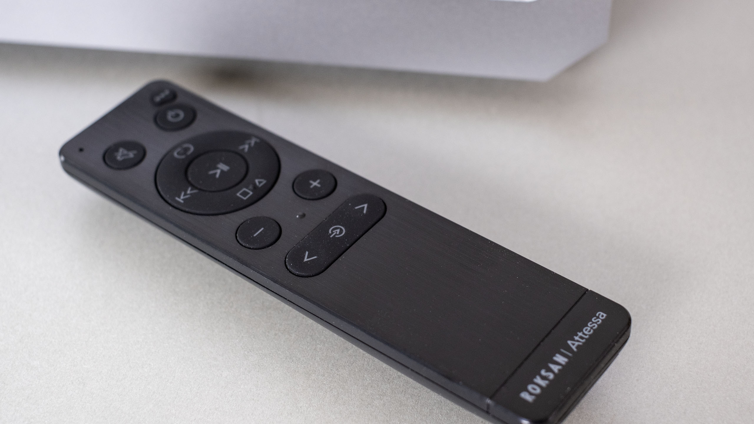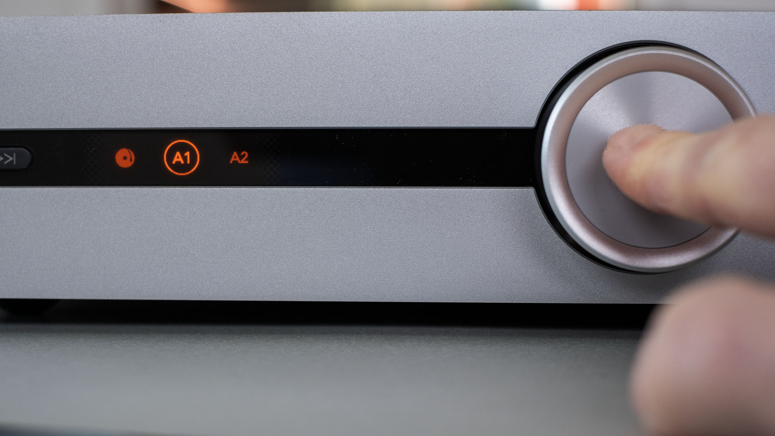 Forstærkeren leveres med en fjernbetjening, der kan betjene alle vitale funktioner, når man ikke ønsker at bruge sin telefon. Ellers er der næsten ingen knapper på forsiden. Tre små knapper styrer afspilningen, og volumenkontrollen fungerer også som indgangsvælger. Tryk og drej for at skifte indgang. Det er lettere sagt end gjort, for modstanden er for stor. Første gang, jeg prøvede, blev forstærkeren, der vejer over 10 kilo, skubbet ud over den glasplade, den stod på.