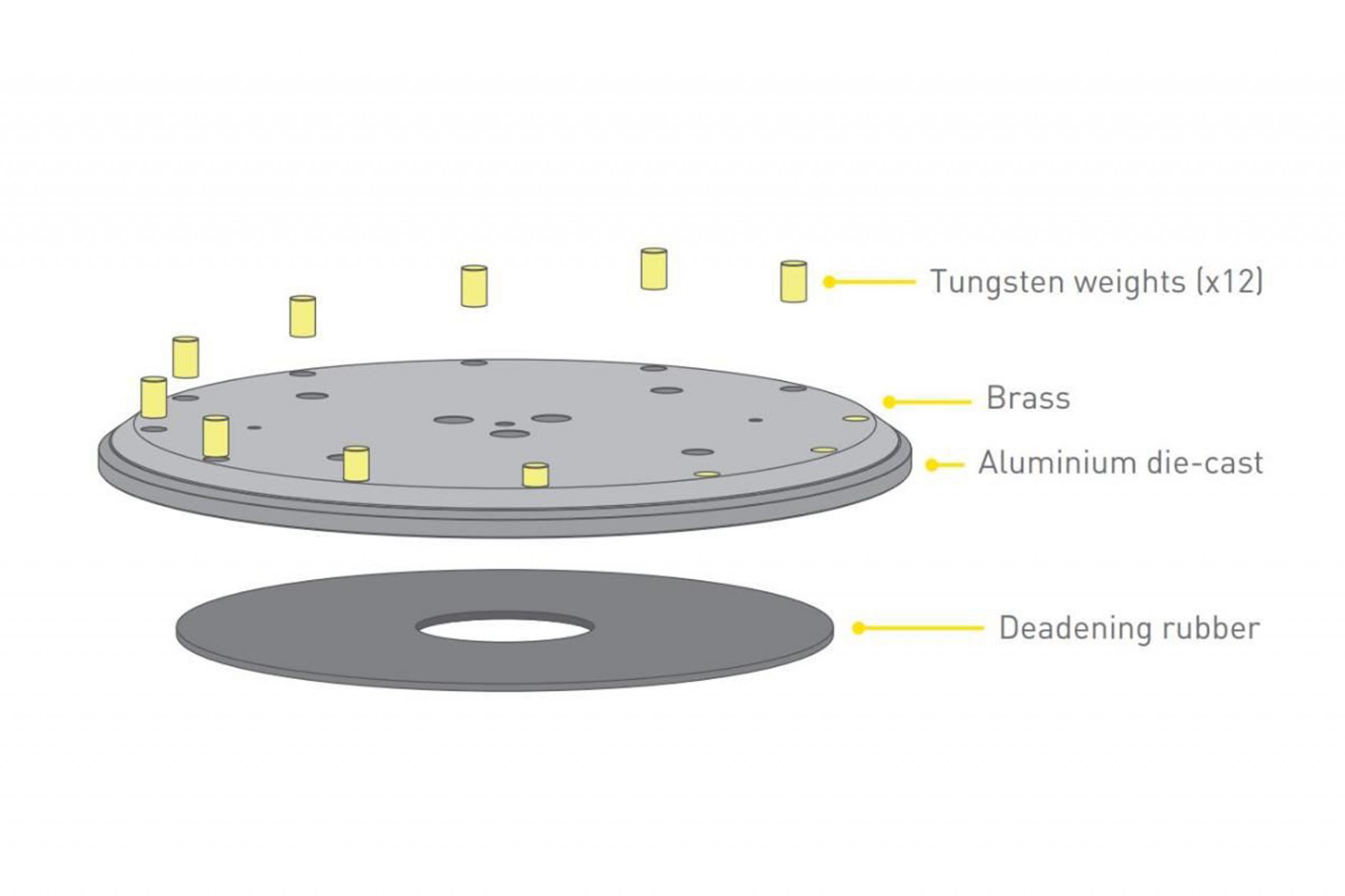 Sidstnævnte er på sin side konstrueret af aluminium og 10 mm messing i to lag, dæmpet med blød gummi på undersiden og balanceret med 12 tungstensvægte, der er indfældet i tallerkenen. Når den monteres første gang, skal den sænkes ned og skrues fast på tre punkter i den rigtige rækkefølge for at opnå perfekt balance.