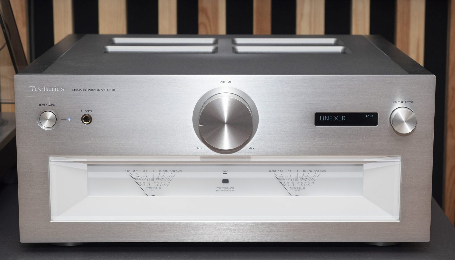 Frontpladen i aluminium er 10 mm tyk og toppladen 6 mm, og vægten på næsten 23 kilo hviler på fire støbte stålfødder. Kvaliteten overgår det meste, vi har testet i denne prisklasse, og de to effektmetre, som vi kender fra bl.a. R1, er blevet en slags signatur for Technics’ forstærkere.