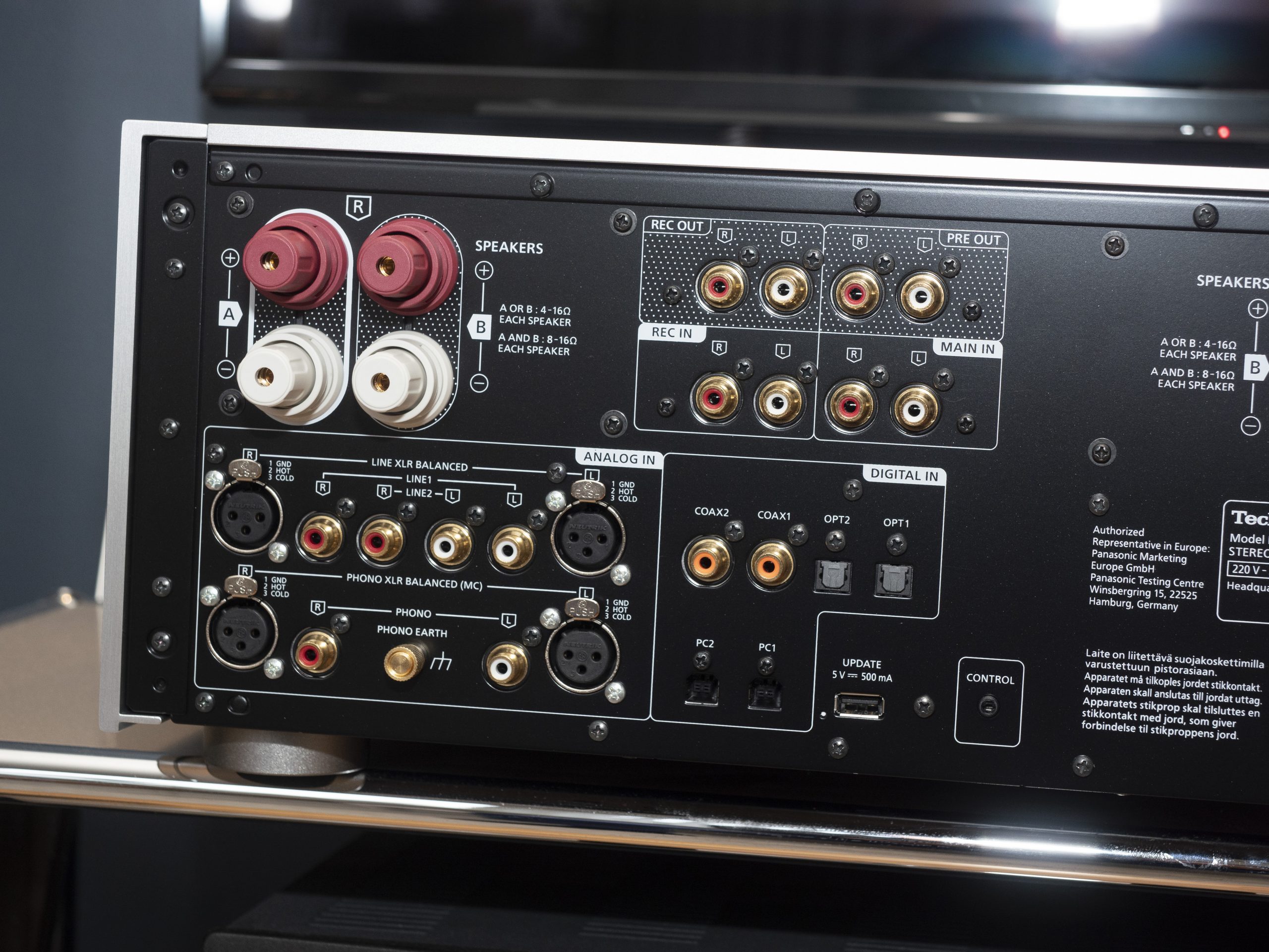 Som de fleste andre har den en indbygget digitalkonverter (DAC), men også analoge indgange og to par pladespillerindgange. Den har ikke streaming i nogen form, hverken trådløst eller via Ethernet, men ideen er nok, at man skal bruge den sammen med en separat netværksafspiller/streamer, f.eks. Technics’ egen, glimrende kombinerede CD- og netværksafspiller SL-G700.