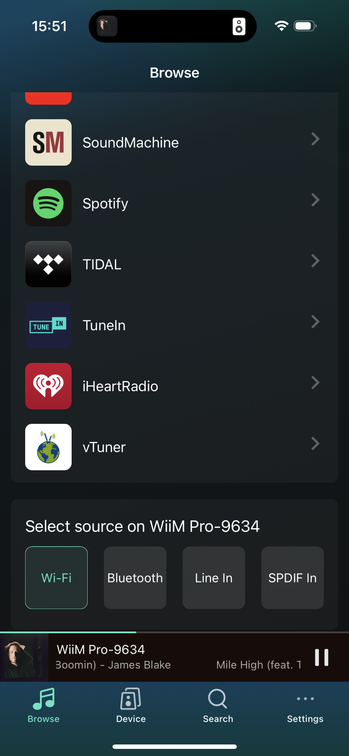 Selv om Wiim Pro også har Bluetooth-streaming, er det først med Wi-Fi – eller Ethernet – at dens potentiale udnyttes fuldt ud. Den understøtter lyd i flere rum (multiroom) med AirPlay 2 ud over Chromecast Home, og den har naturligvis stemmestyring med Siri, Google og Alexa. App’en understøtter en lang række streamingtjenester, Tidal Connect, Spotify Connect, Qobuz, TuneIn radio og mange flere, deriblandt Amazon.
