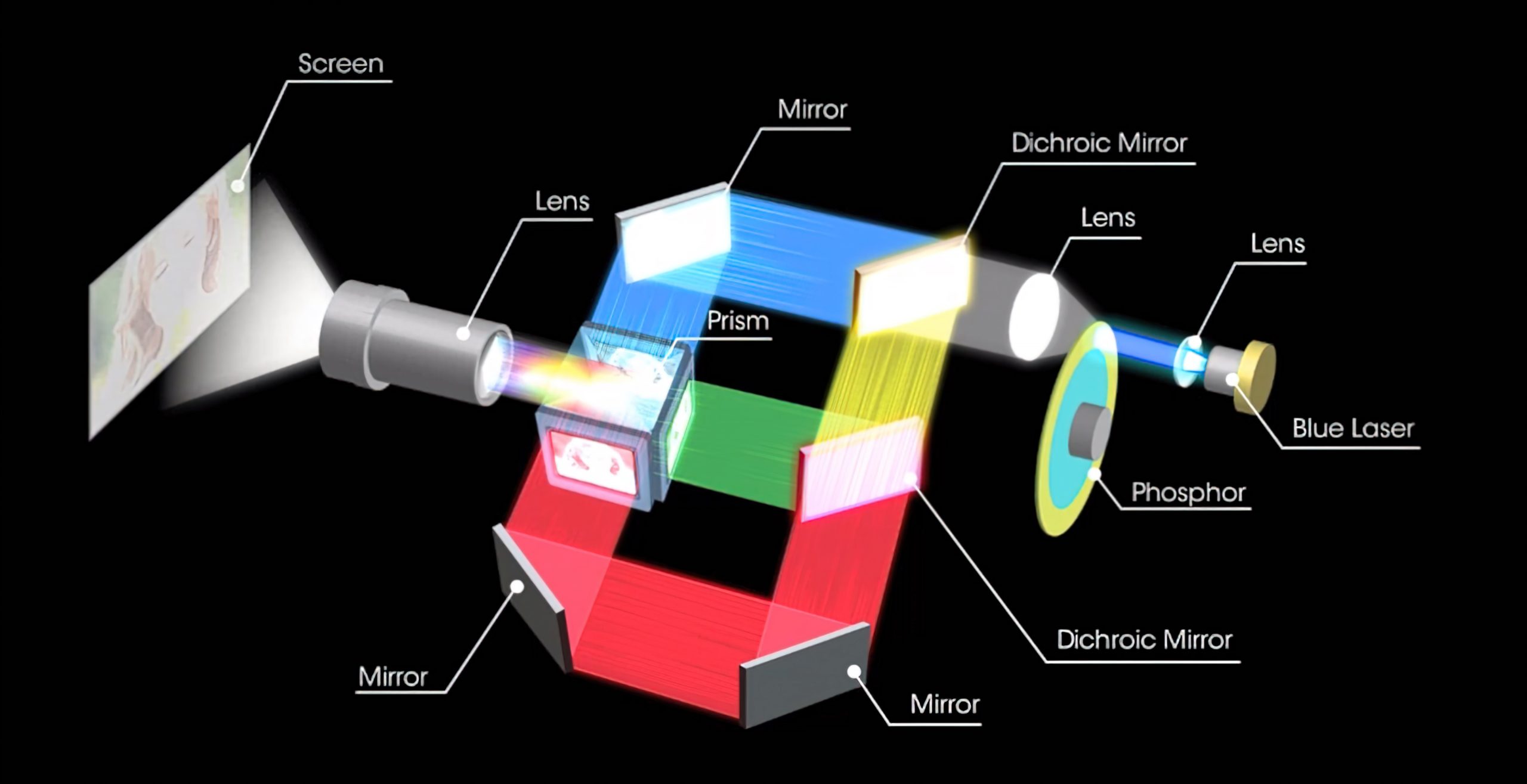 Laseren er af typen Z-Phosphor, som producerer et blåt laserlys. Når det skinner igennem et farvefilter, spaltes lyset i de tre primærfarver rød, grøn og blå. Det er en langt mere effektiv lyskilde end en almindelig lampe og giver mere tryk på lyset, ligesom farvebalancen holder sig stabil uanset lysstyrken.