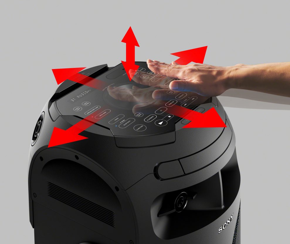Når man har et så stort højttalerkabinet, behøver man ingen tricks for at få ordentlig party-lyd. Sony har udstyret den med seriøse enheder, der kan flytte så meget luft, at man faktisk kan mærke lydtrykket, og ruderne begynder at rasle. Især med Jet Bass Boost, der bogstavelig talt får buksebenene til at flagre. Og hvis man har et stort festlokale, kan op til 50 (!) kompatible højttalere forbindes.