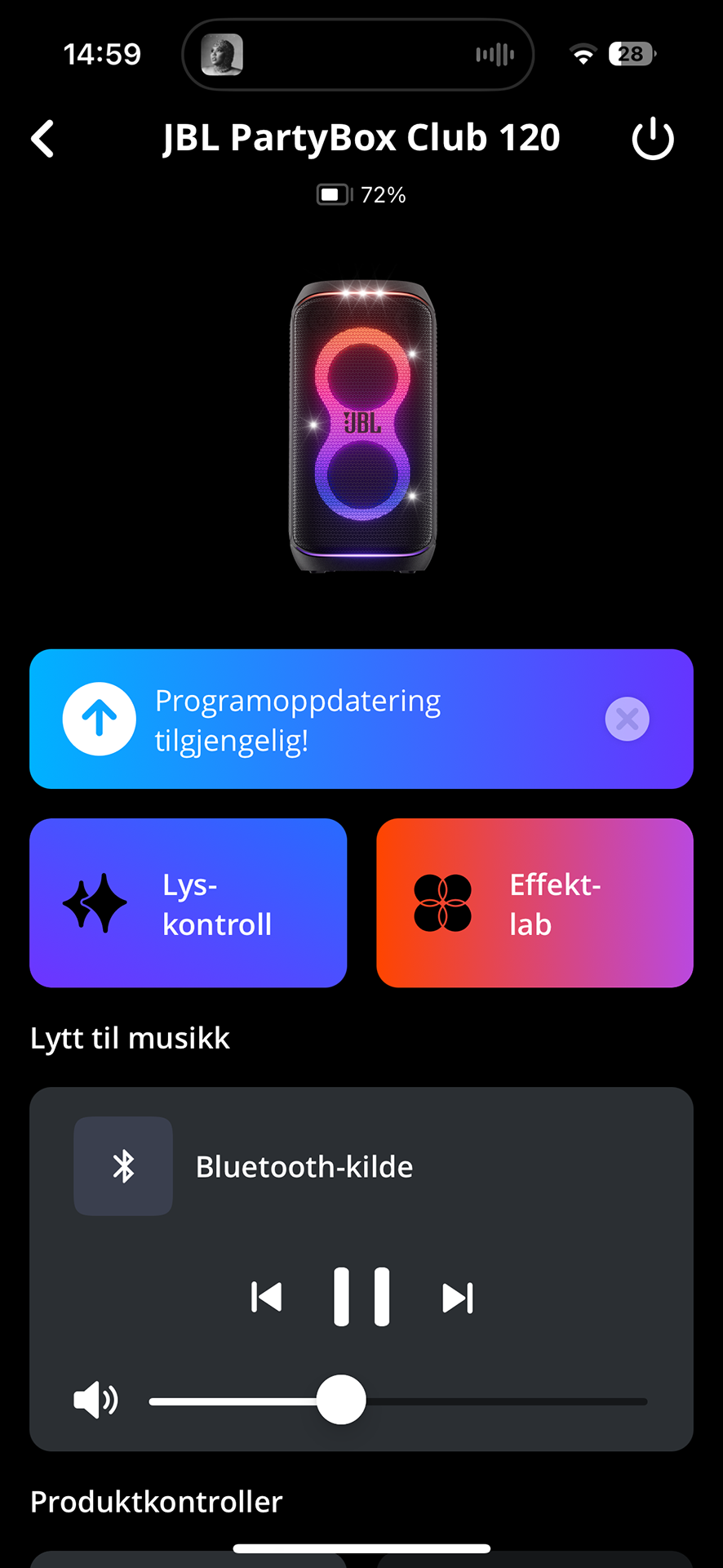 Party Club 120 er meget mere kraftfuld end både Xtreme 4 og Boombox 3 Wi-Fi. Med en effekt på 160 watt når den op på et lydtryk, som de mindre højttalere ikke er i nærheden af. Og ikke nok med det. Her får man også DJ-effekter i app’en og indgange til mikrofoner eller guitar, så man kan bruge højttaleren som et lille PA-anlæg. Den har også LED-lys, der blinker og roterer i takt med musikken, og sidst, men ikke mindst: den har et aftageligt batteri.