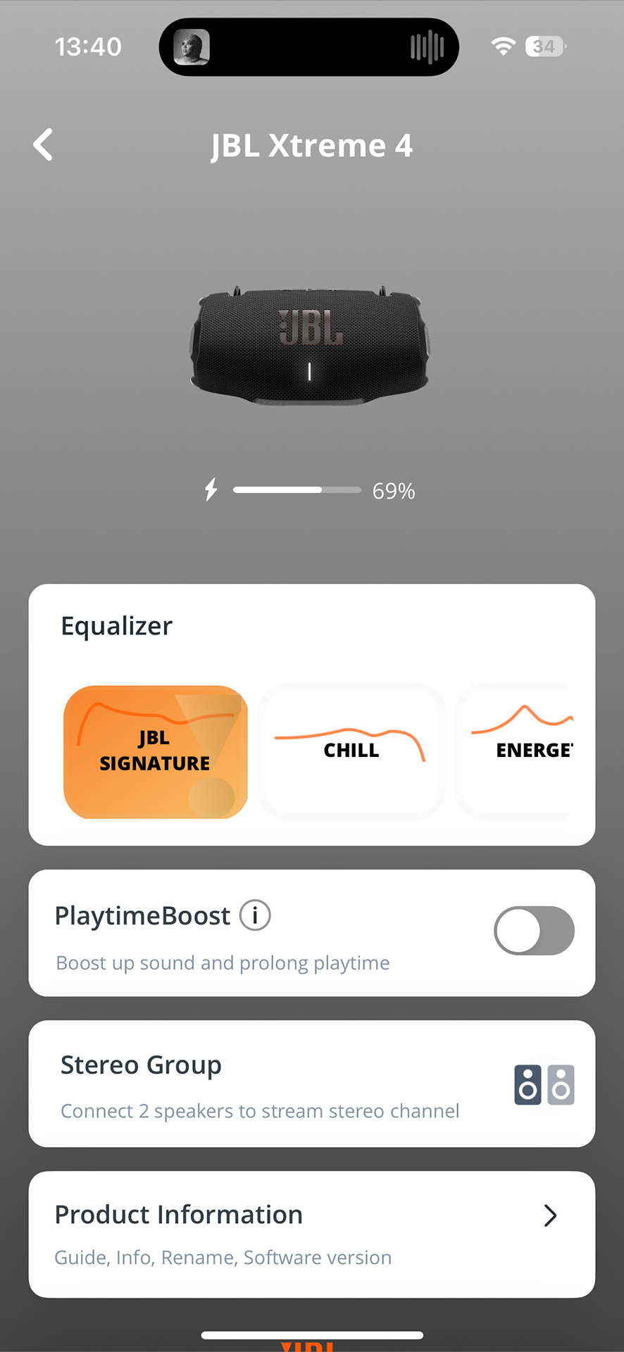 Med en vægt på godt to kilo og kompakte dimensioner er den nem at tage med overalt. Den beskedne størrelse er ikke gået ud over batteriet. Ved moderat høj lydstyrke kan den spille i op til 24 timer, og den kan parres med en anden Xtreme 4, hvis man vil have bedre lyd i stereo. Man kan i praksis tilslutte så mange JBL-højttalere, man vil, hvis de også understøtter JBL PartyBoost.