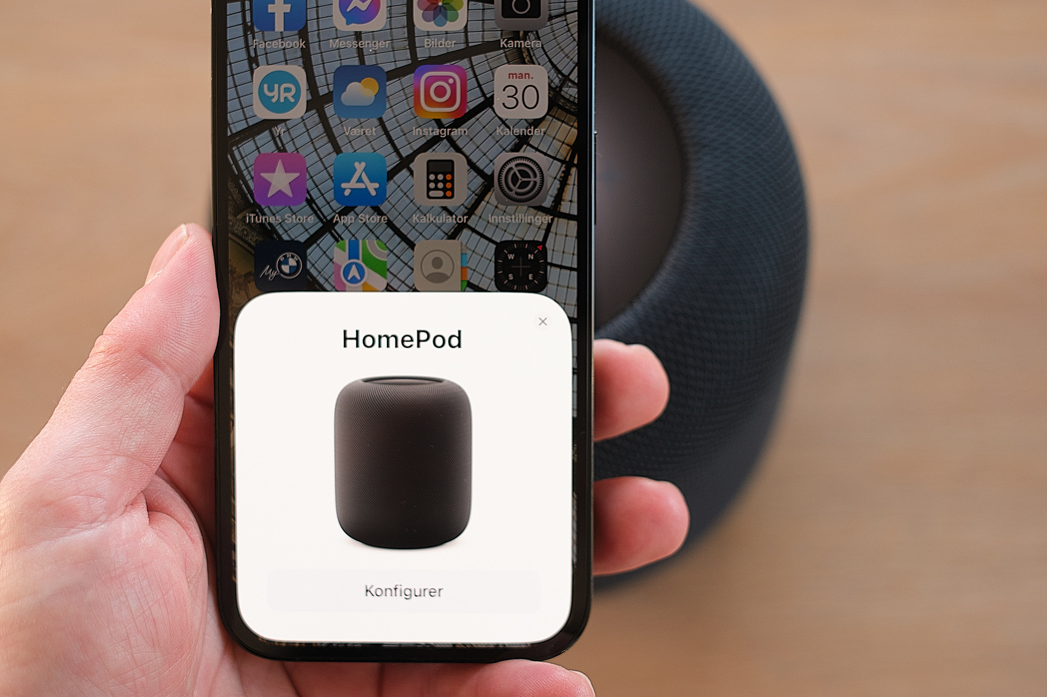 HomePod har ikke indbygget batteri og er heller ikke bærbar. Den sættes i stikkontakten med den medfølgende Apple-ledning, og så tændes touchskærmen oven på højttaleren. Derefter holder du mobilen over højttaleren, og har du en iPhone, kommer højttaleren frem på skærmen. Så følger du blot instruktionerne på mobilen, og du er klar til at spille musik efter et par minutter.