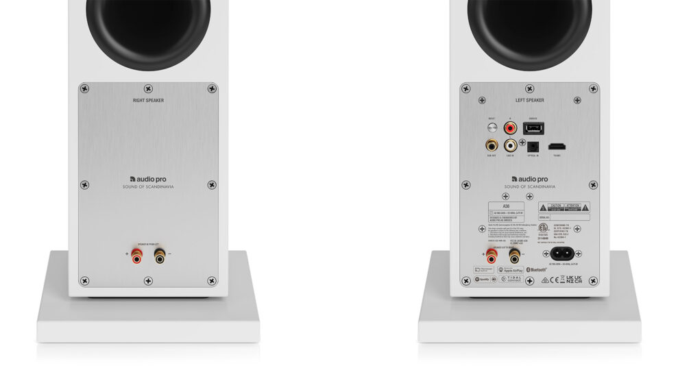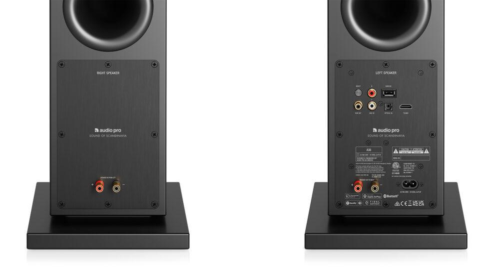 Audio Pro A38 har et imponerende antal tilslutningsmuligheder i forhold til prisen. Der er indgange for analog stereo RCA, optisk TosLink og HDMI. Og en RCA-udgang til subwoofer.